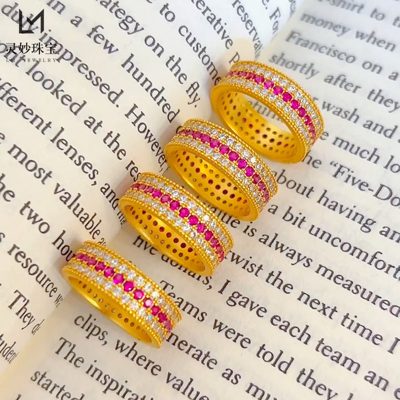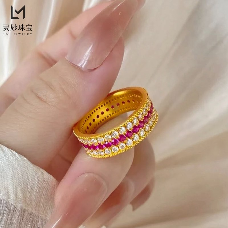 韦雪同款古法沙金999点钻闪动蔷薇戒指红舞裙刚S玉排钻指环送女友
