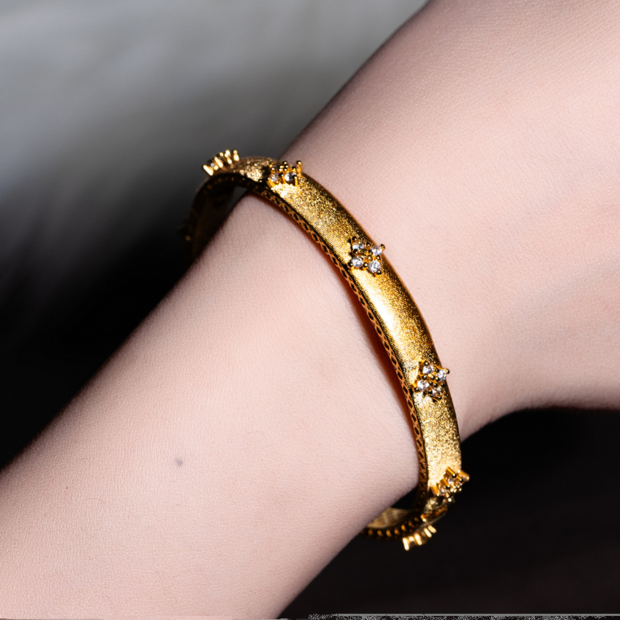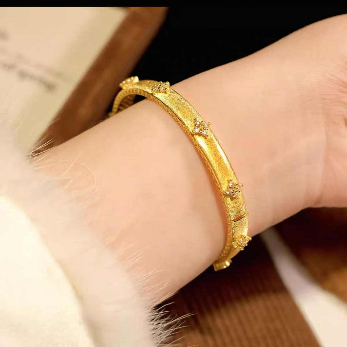 古法沙金镶钻四叶草拉丝卡扣手镯女时尚气质
