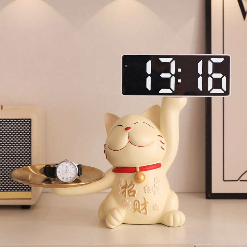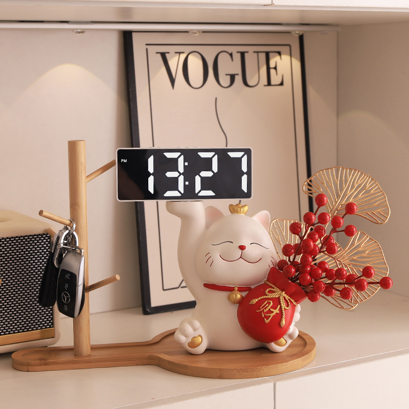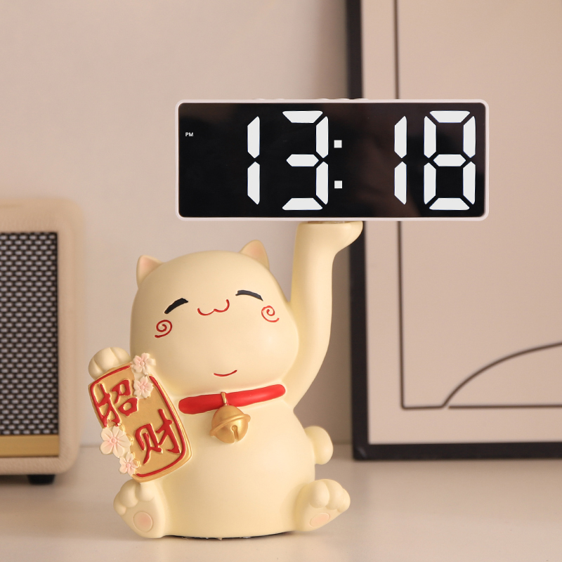 创意招财猫座钟电子时钟桌面钟表闹钟摆件家用台式数字钟