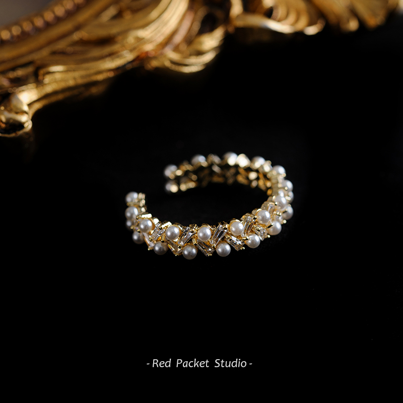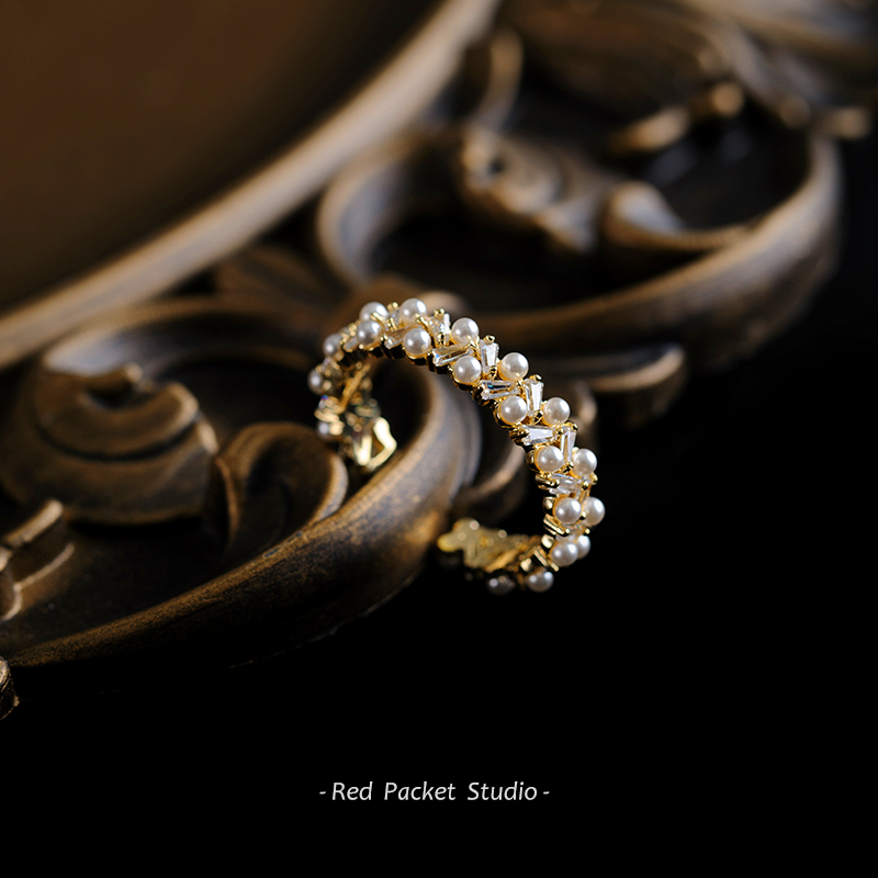 红口袋 复古优雅轻奢超闪日韩珍珠水钻波浪边开口可调节戒指指环