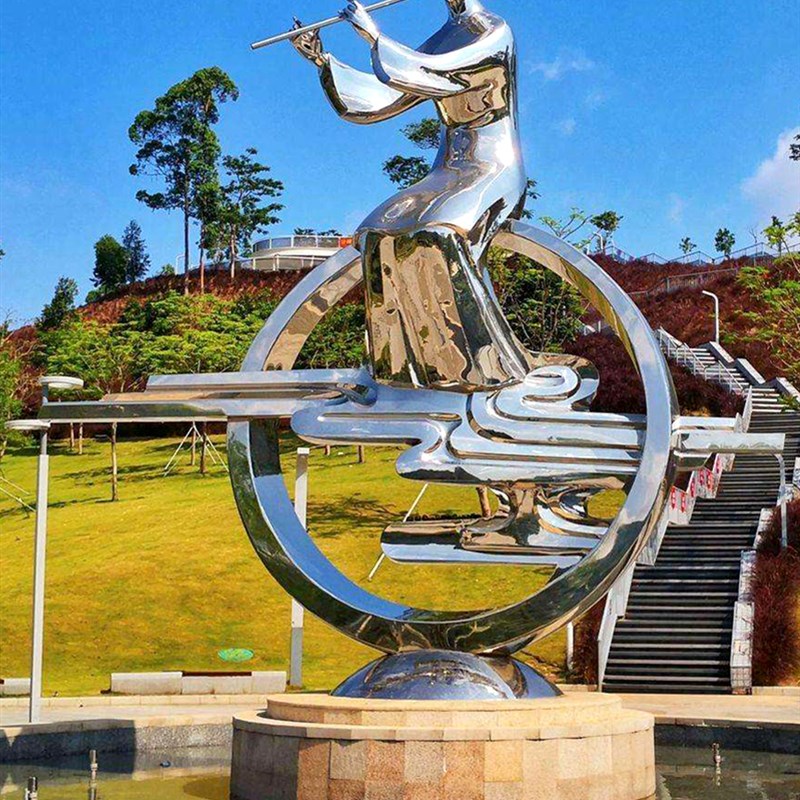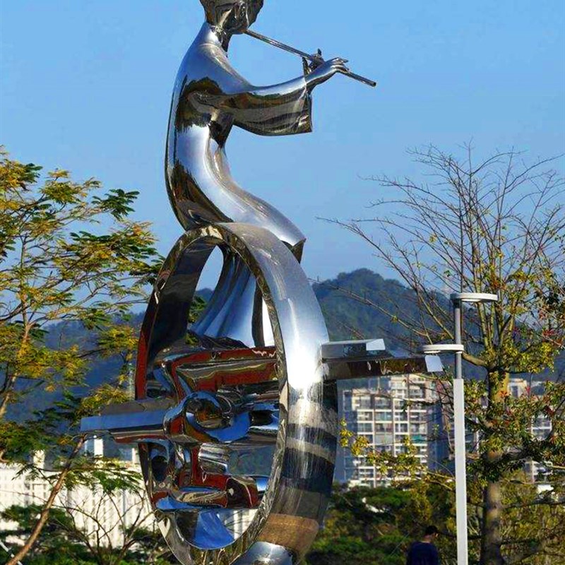 不锈钢抽象景观造型定制户外大型镜面人物雕塑吹笛少女小区装饰