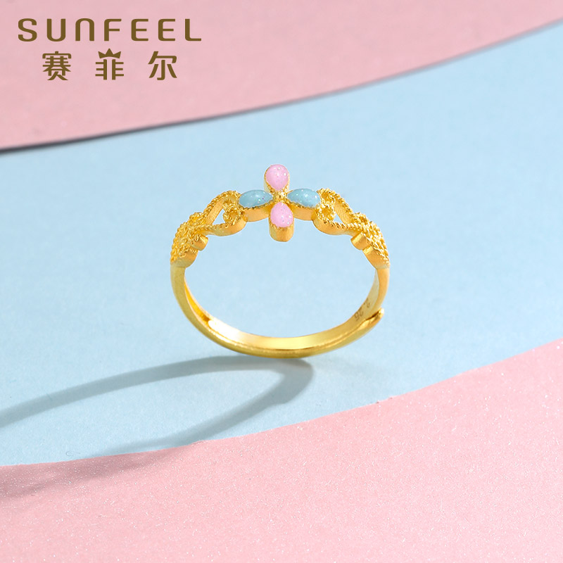 赛菲尔黄金戒指足金999.9四叶草戒指古法金珐琅戒子花朵女戒送礼