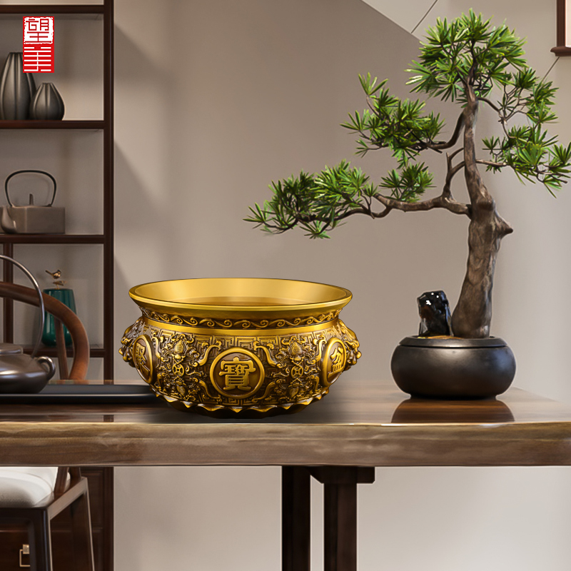黄铜聚宝盆摆件中式招客厅办公室店铺财装饰品黄铜米缸存钱罐大号