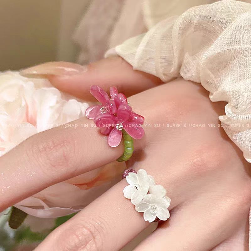 多巴胺紫罗兰彩色花朵戒指女早春精致串珠食指戒小众叠戴闺蜜指环
