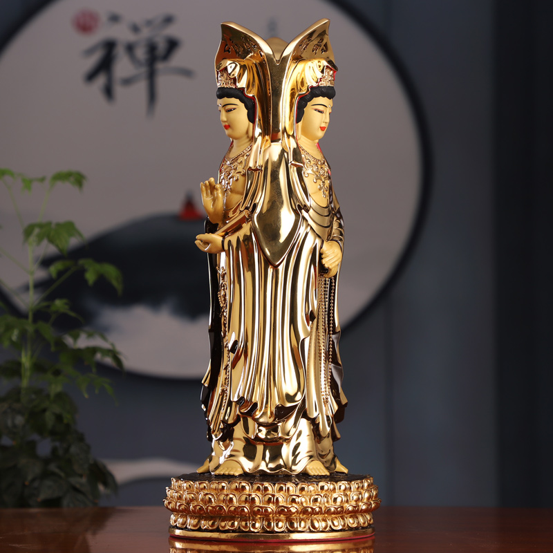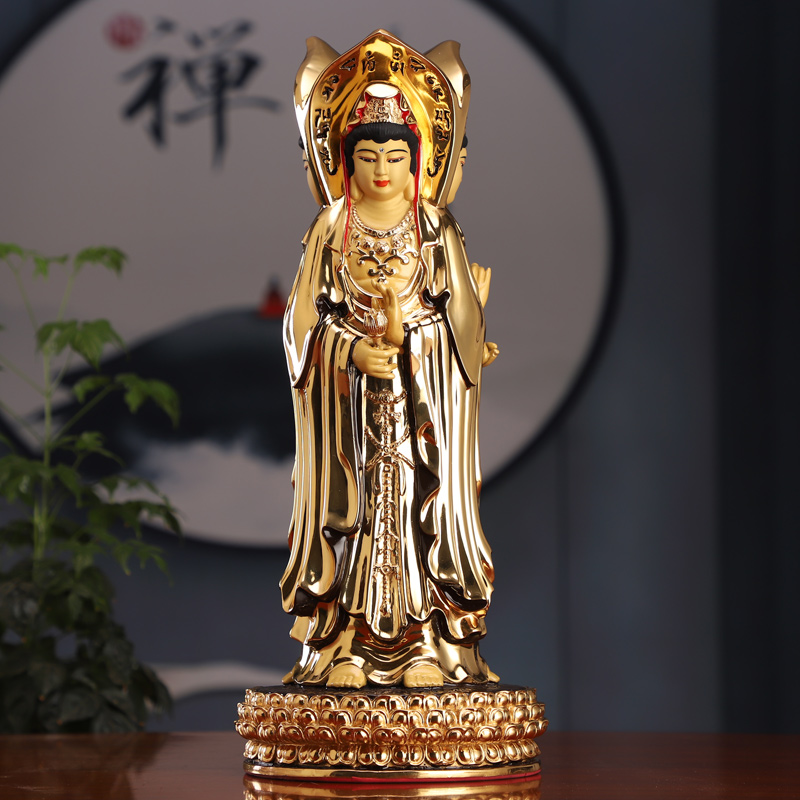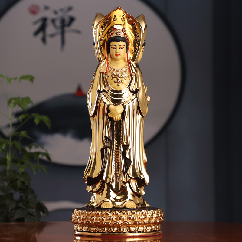 台湾盛凡铜鎏金海上观音站像三面观音佛像家用供奉观世音菩萨摆件