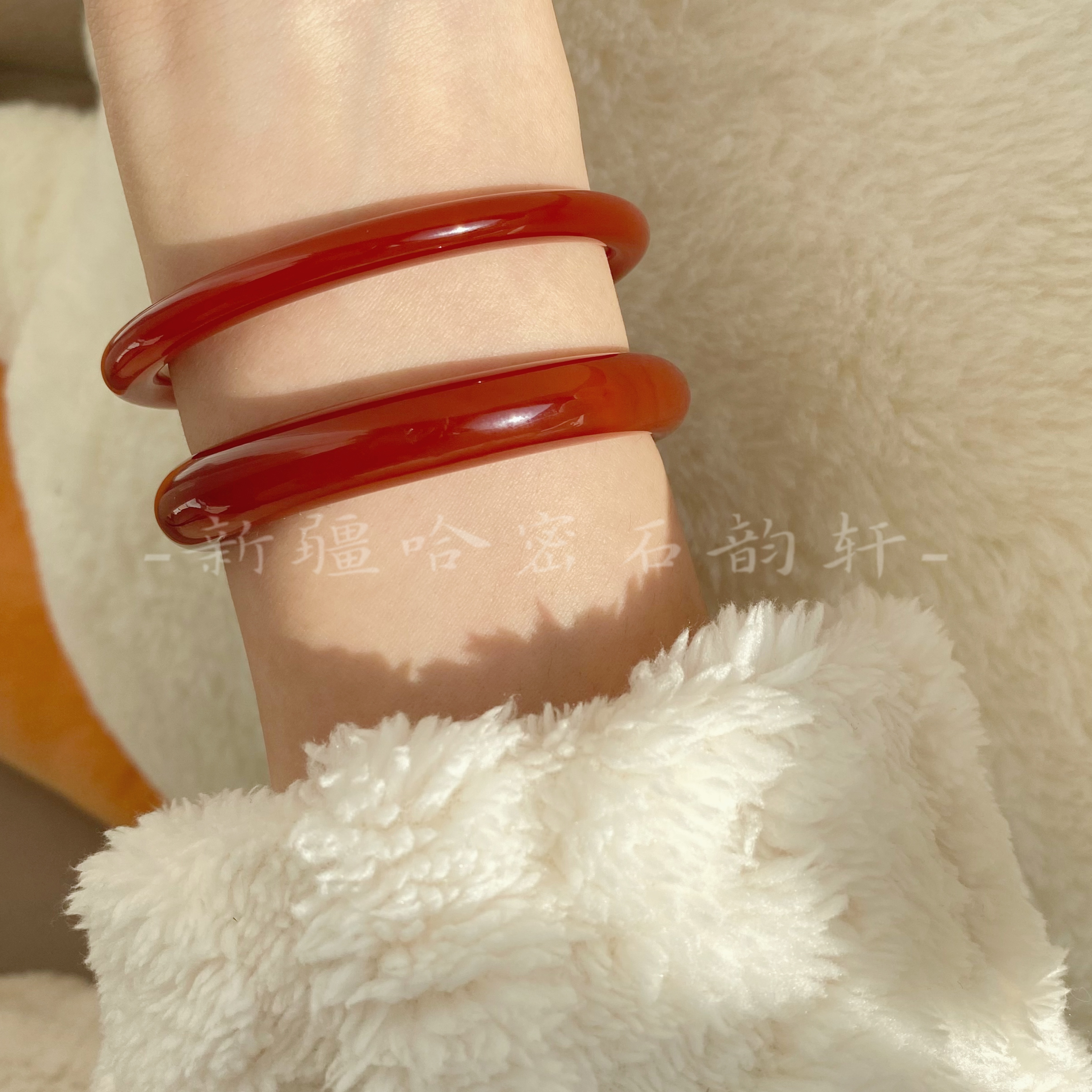 红玛瑙玉髓玉手镯天然正品红色本命年中宽圆条新中式生日礼物高级