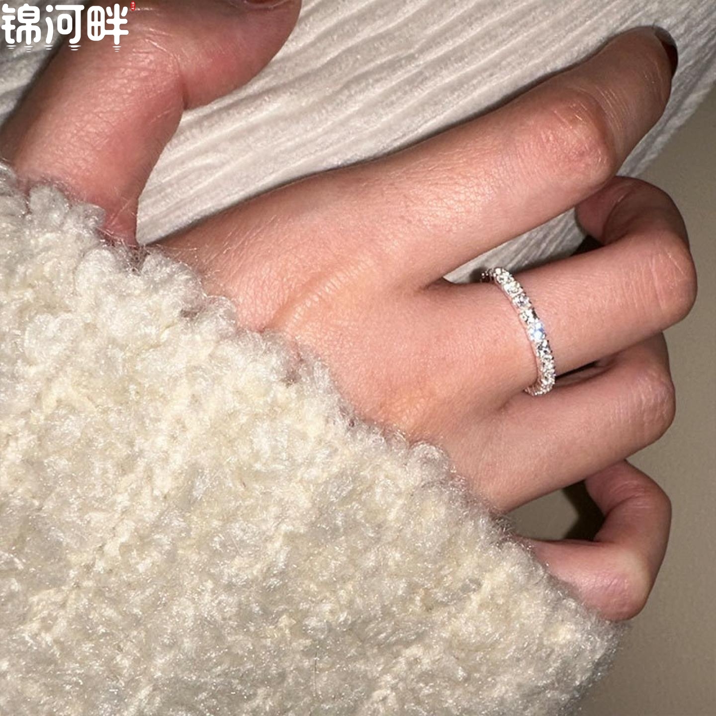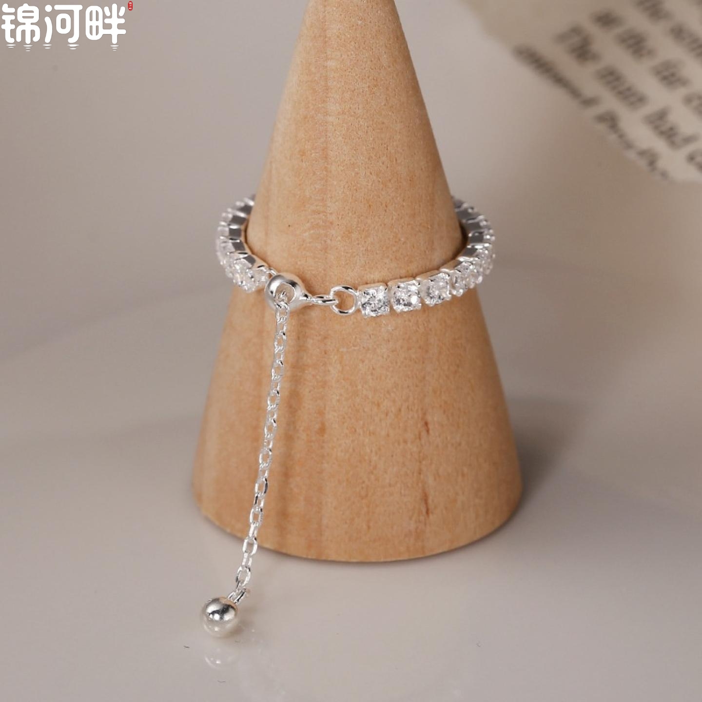 锦河畔 925纯银闪指简约气质抽拉式链条银珠满钻食指指环女士高级