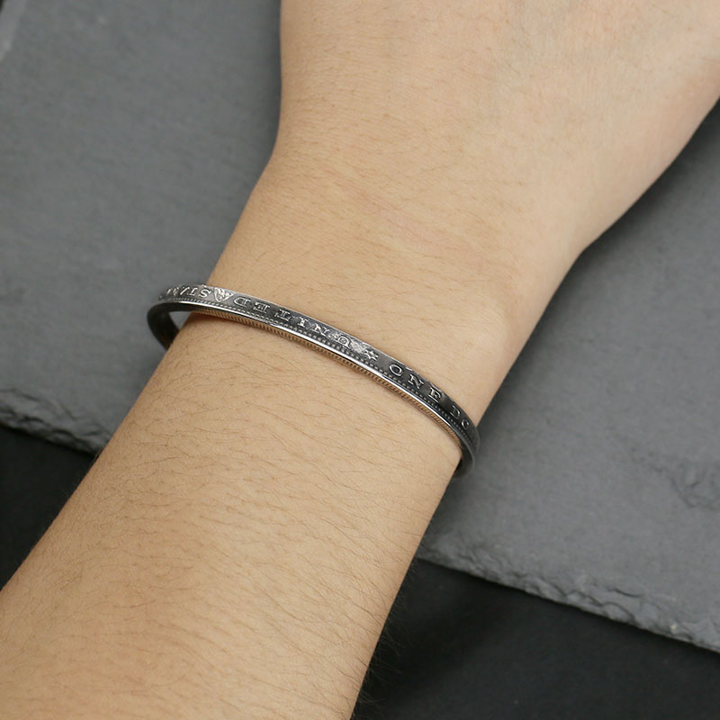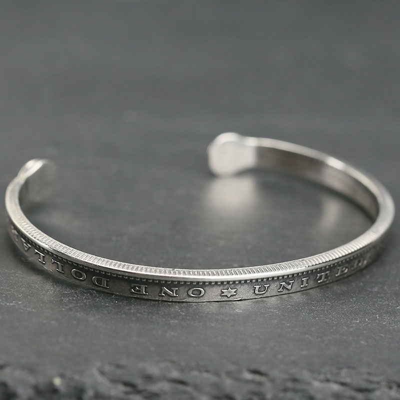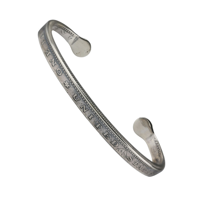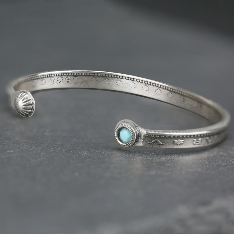 牛钝精工 NW美国摩根银币窄款手镯绿松石菊花钉纯银925男女银饰
