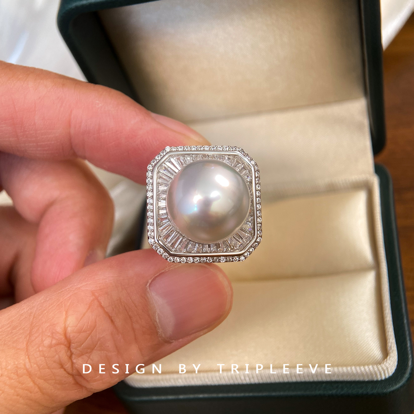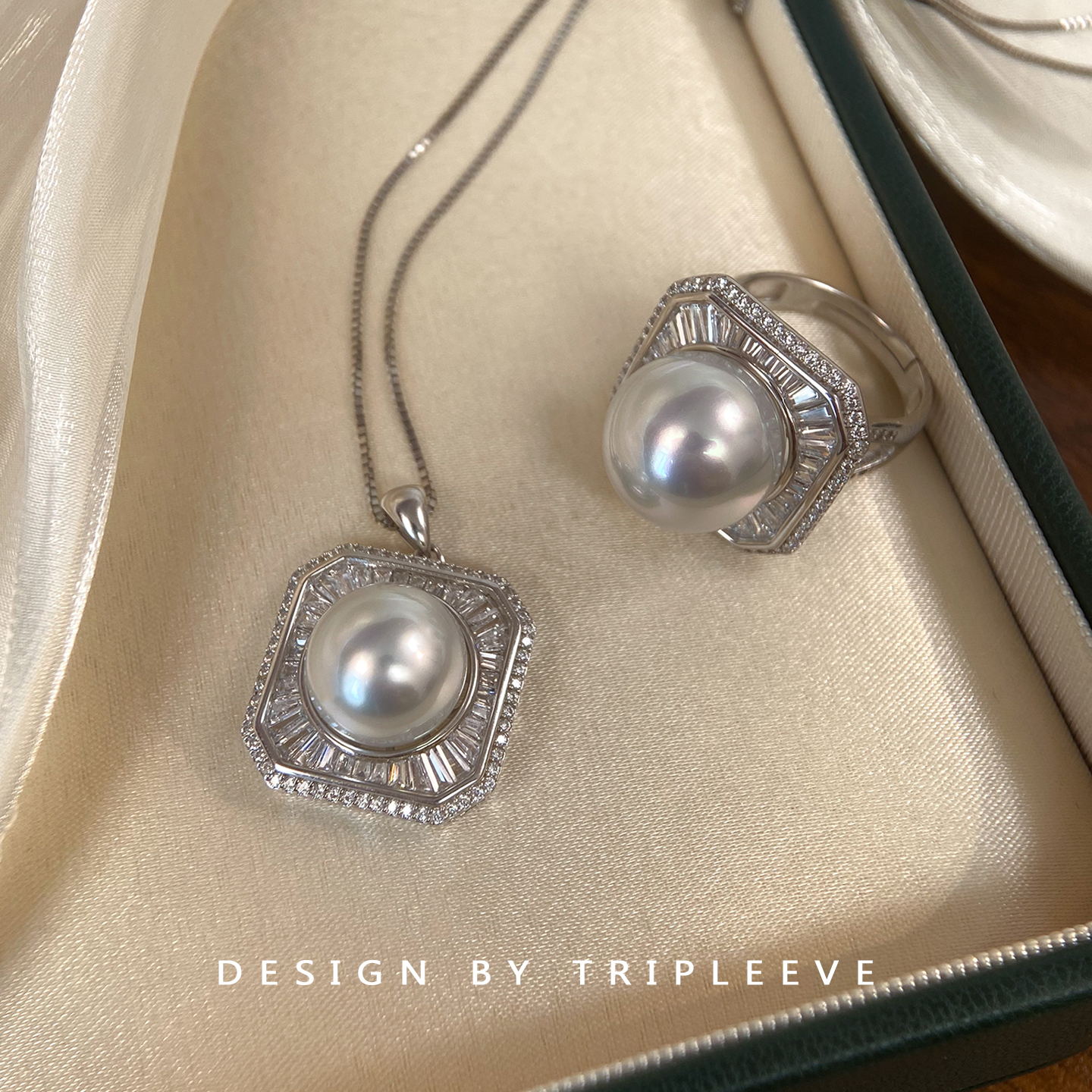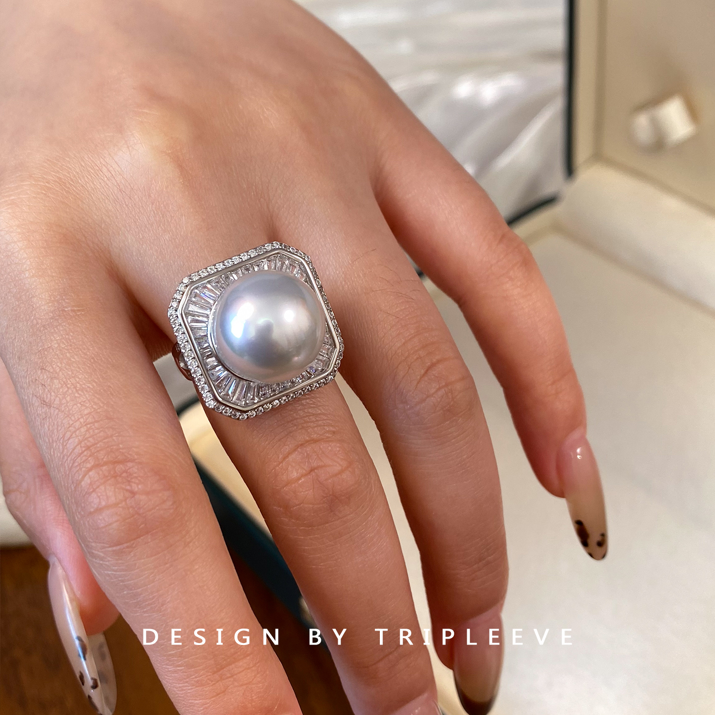 经典日出系列蓝血澳白珍珠戒指通体s925纯银几何排钻满镶气质奢华