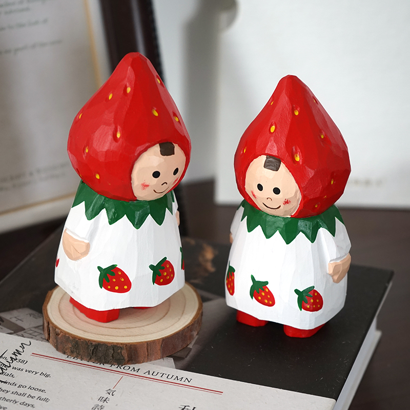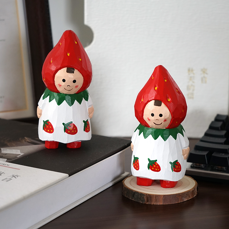 草莓娃娃手工木雕小摆件公仔可爱木质雕刻治愈系卡通书桌装饰品