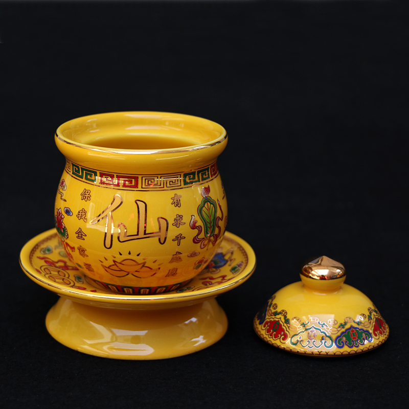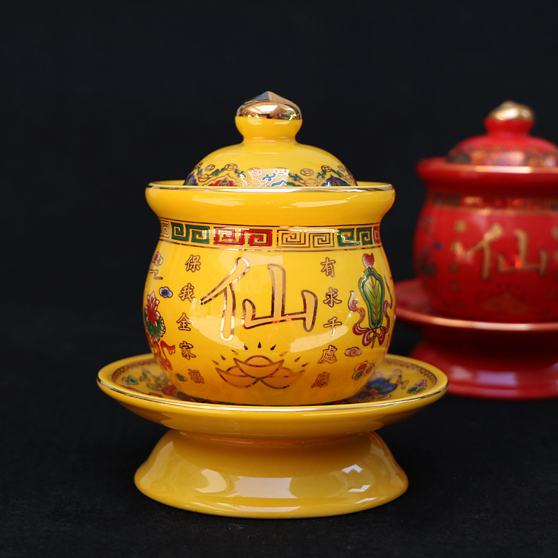 速发仙奉仙家水杯供家圣水杯 陶瓷净水杯红色黄色八吉祥家用佛供