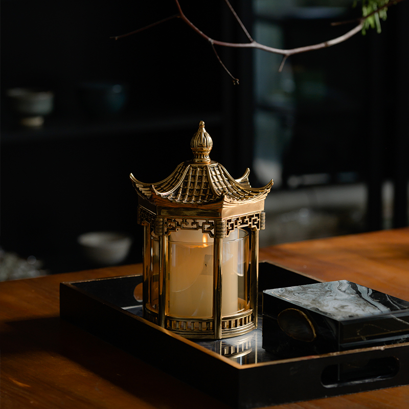新中式样板间亭子烛台太湖石毛笔架磨砂J透明马摆件茶室书房装饰