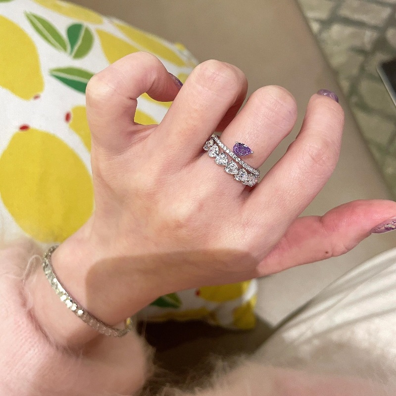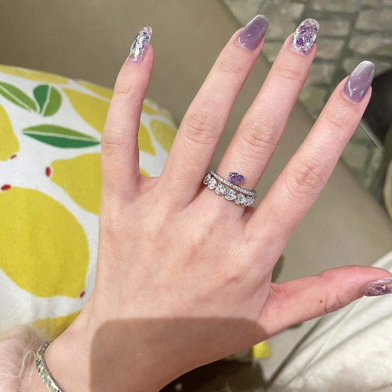 v金材质保色高级浪漫紫色水滴爱心排钻戒指叠戴设计精致指环