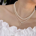 法式优雅蝴蝶结双层灰色珍珠项链ins气质百搭高级感锁骨链颈链女