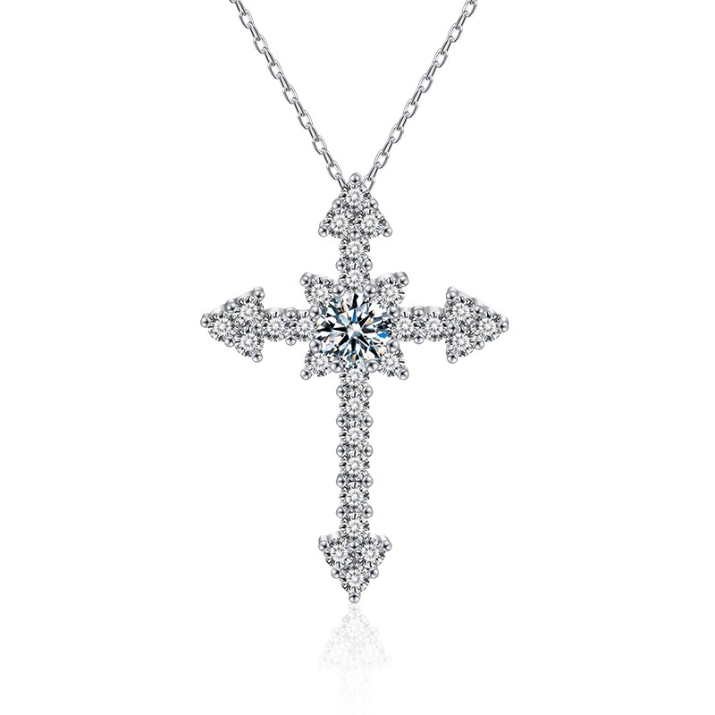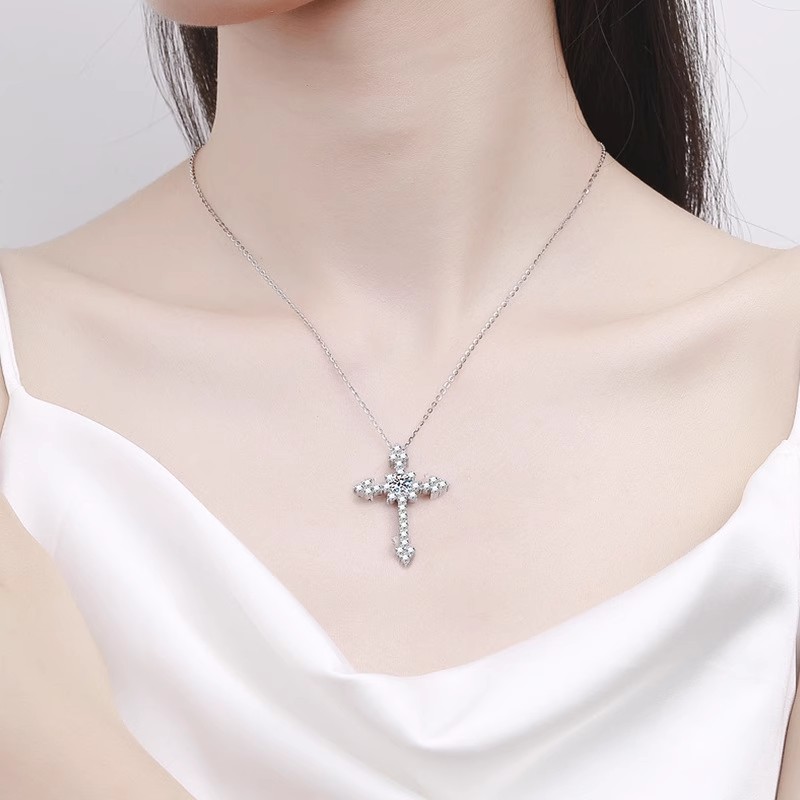 S925纯银项链莫桑石十字架吊坠男女轻奢满钻爆闪欧美时尚小众首饰