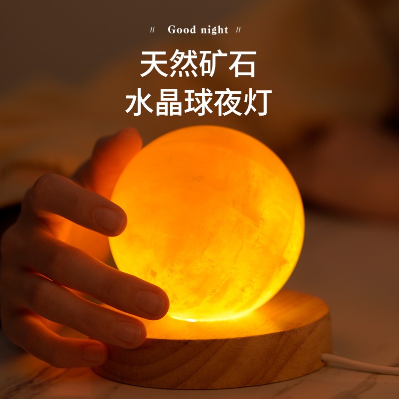 天然水晶球方解石橡胶木底座卧室床头创意小夜灯家居桌面摆件