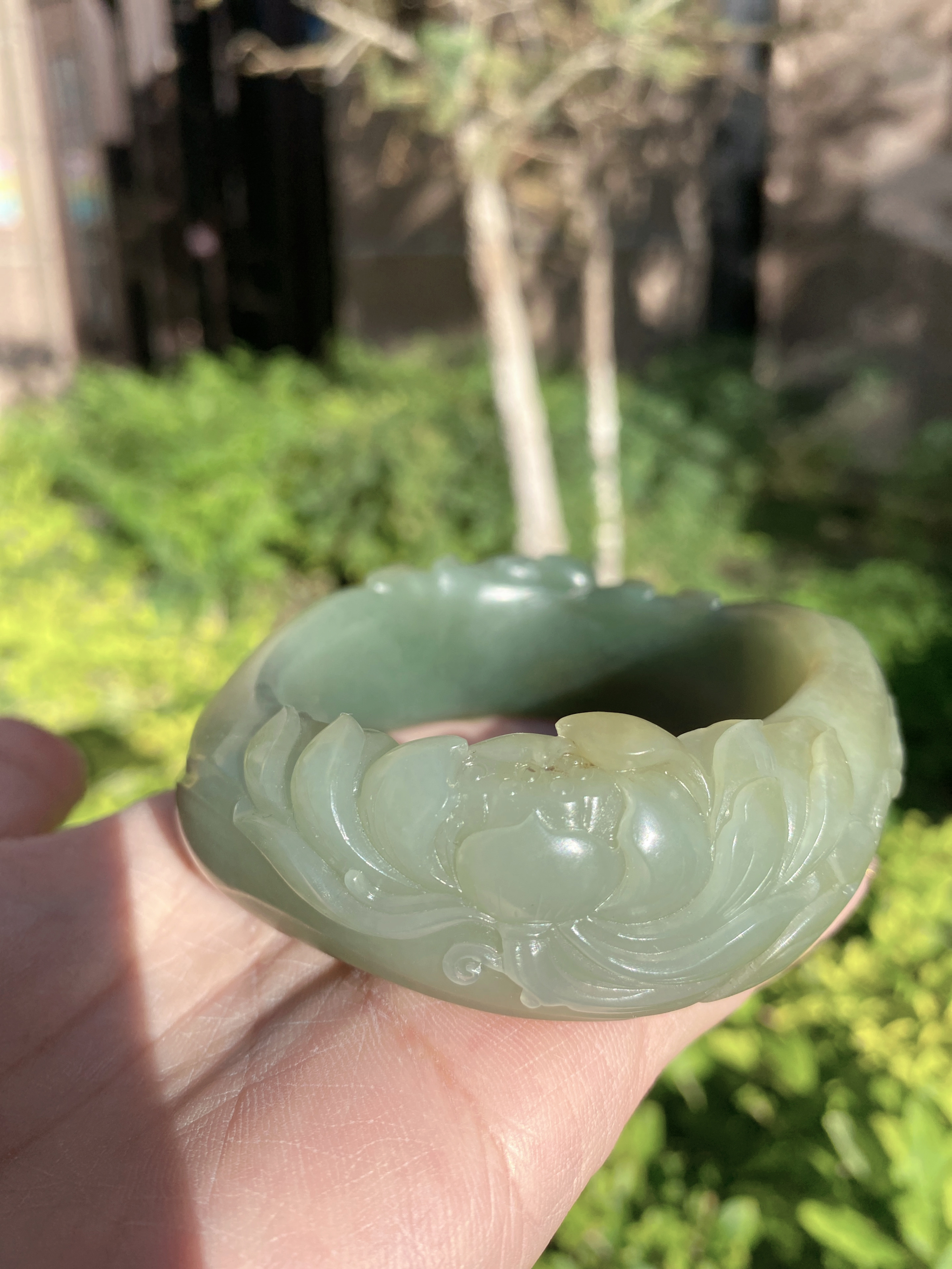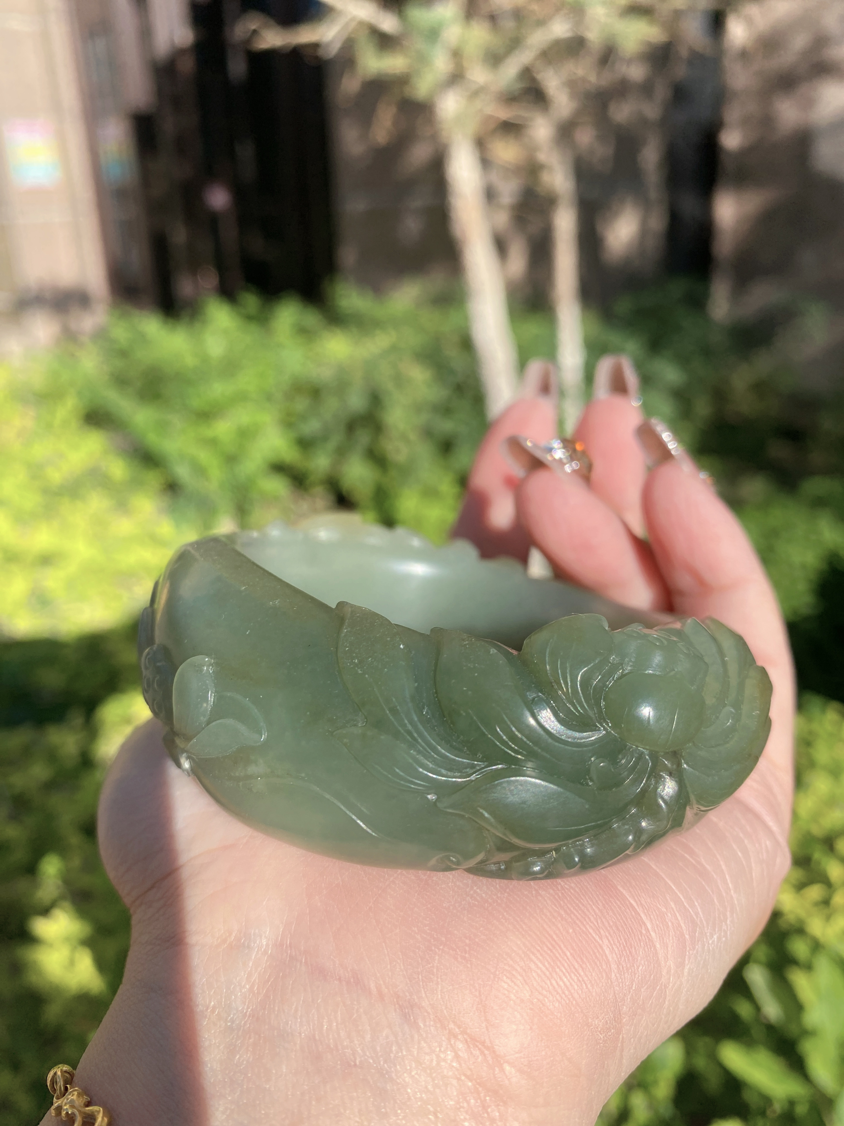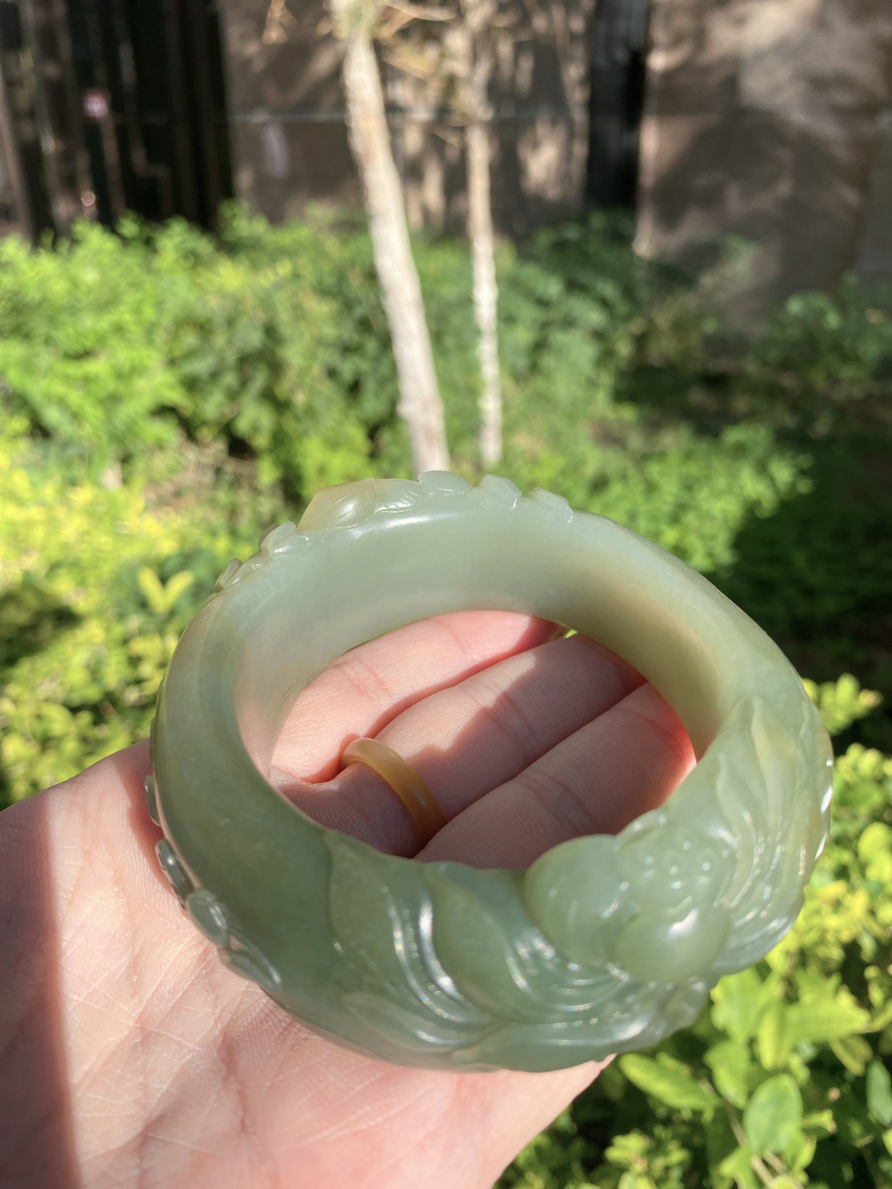 新疆和田玉翠青籽料手镯荷花巧雕双生莲意境随型镯