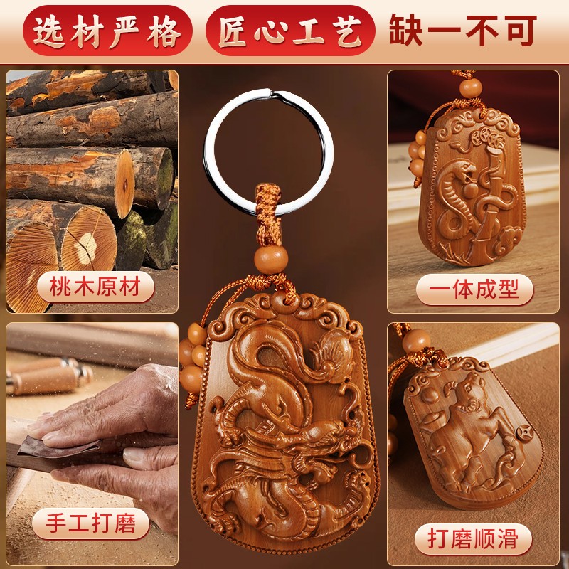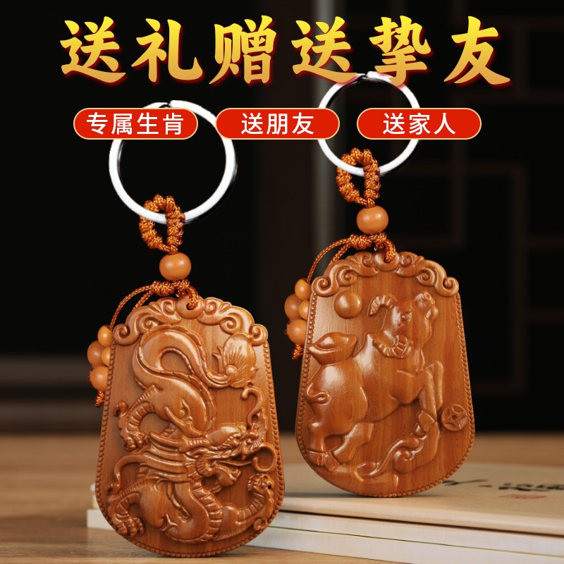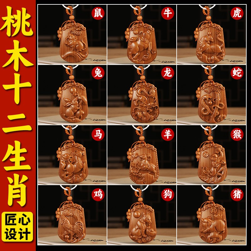 十二生肖桃木挂件钥匙扣雕刻属相随身挂饰吊坠手工木雕送礼佳品