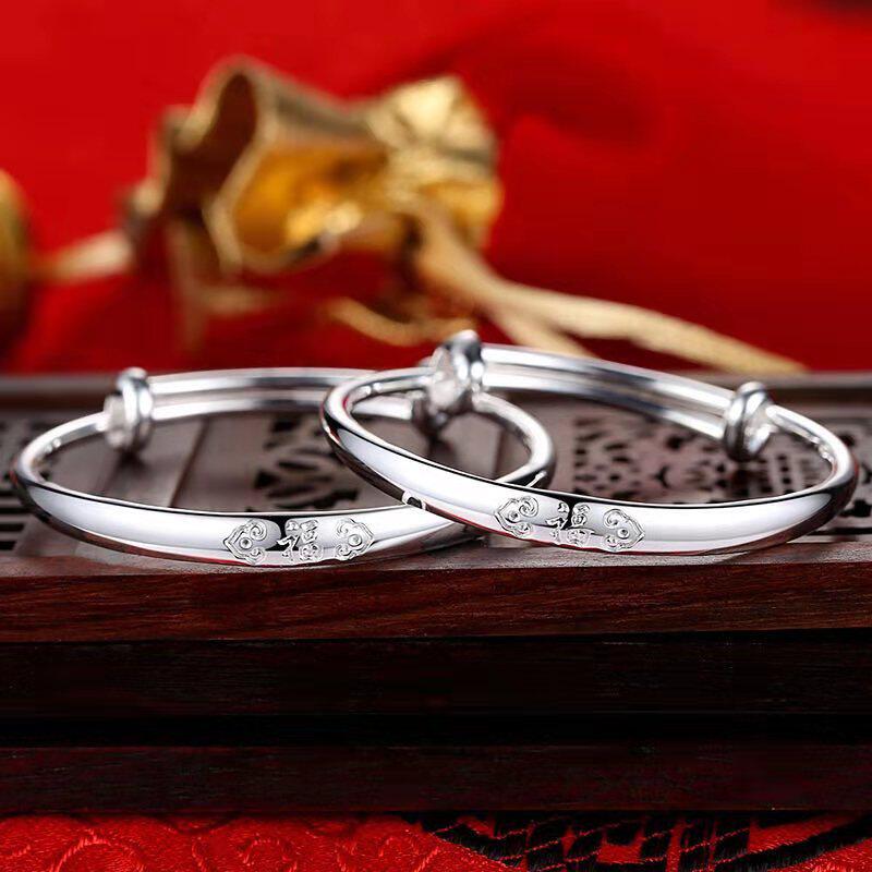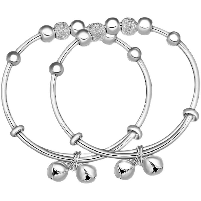 999纯银手镯女公主铃铛凯蒂猫儿童小孩宝宝实心推拉光面婴儿镯子