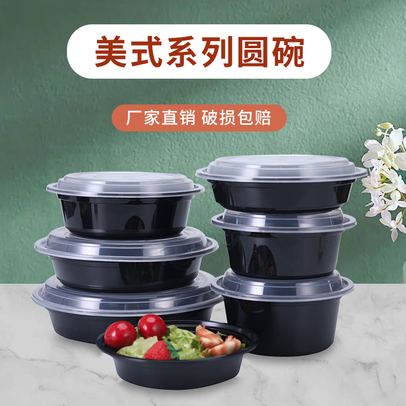 特厚750/1000ml美式圆形一次性餐盒带盖黑色打包盒外卖饭盒便当碗