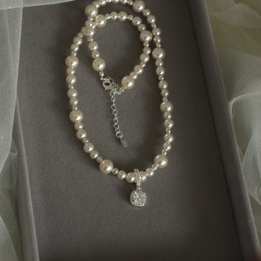 小方块吊坠 白色珍珠水滴项链生日礼物高级感锁骨链礼服链气质