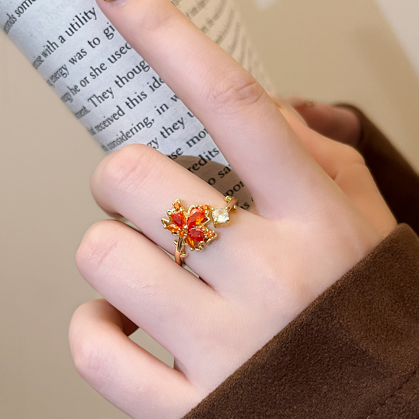 红色枫叶锆石开口戒女小众设计2025新款爆款轻奢高级感食指戒指环