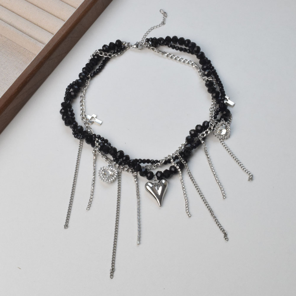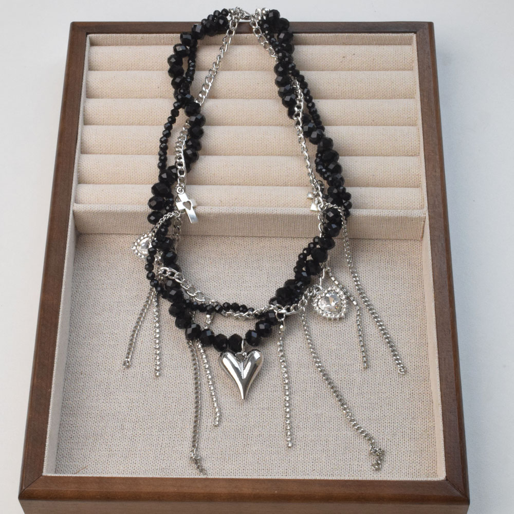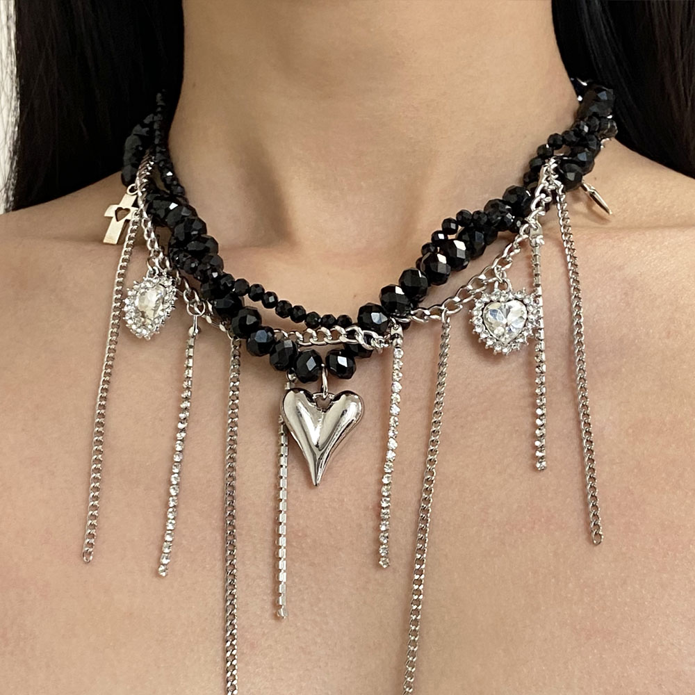 时髦复古多层缠绕镶钻爱心桃心流苏项链女choker黑串珠锁骨链颈链