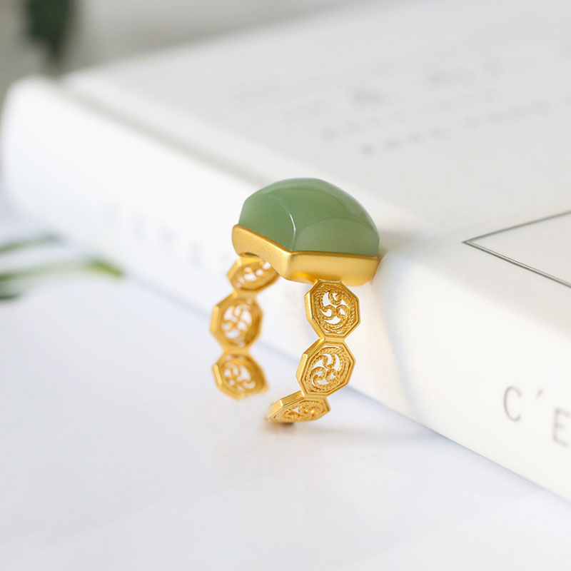 古法金镀金故宫上新玉青玉花纹指环复古个性时尚开口戒指饰品