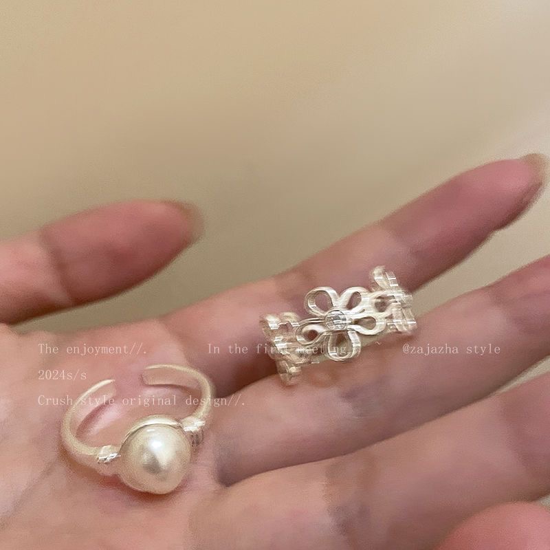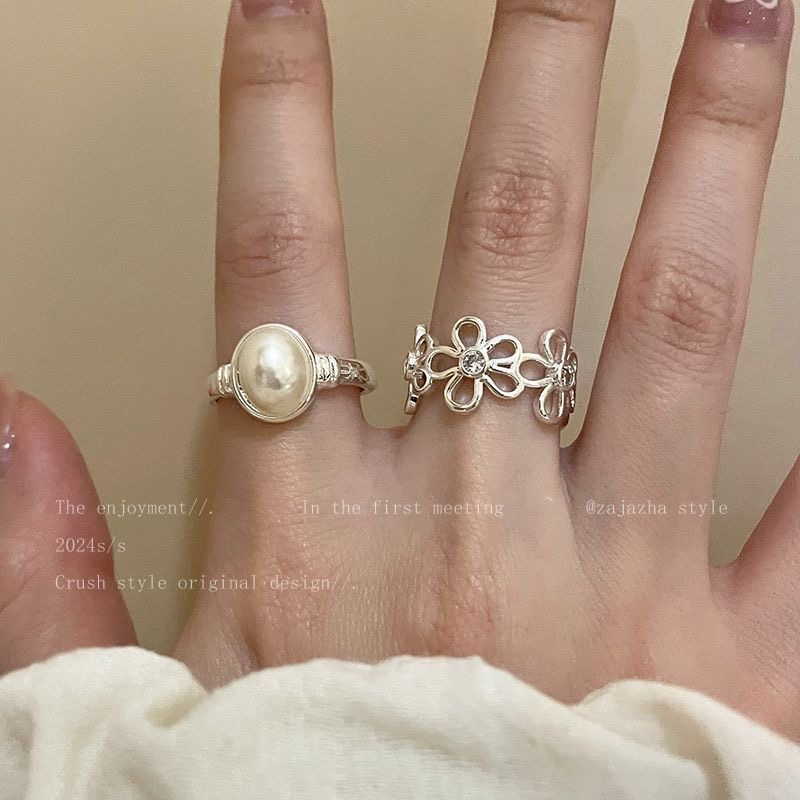 珍珠花朵开口戒指女轻奢高级感百搭通勤食指戒冷淡风小众设计指环