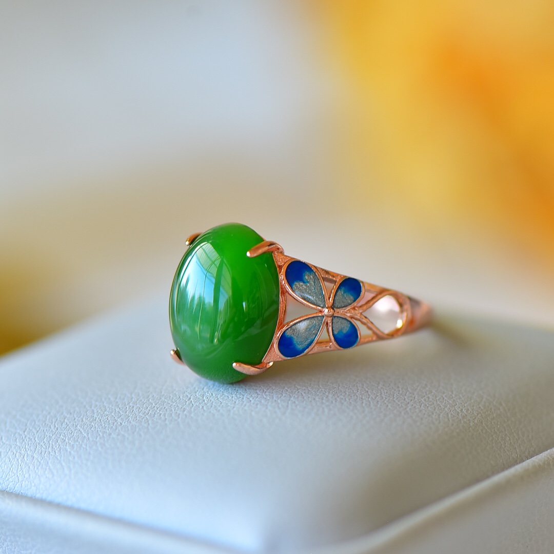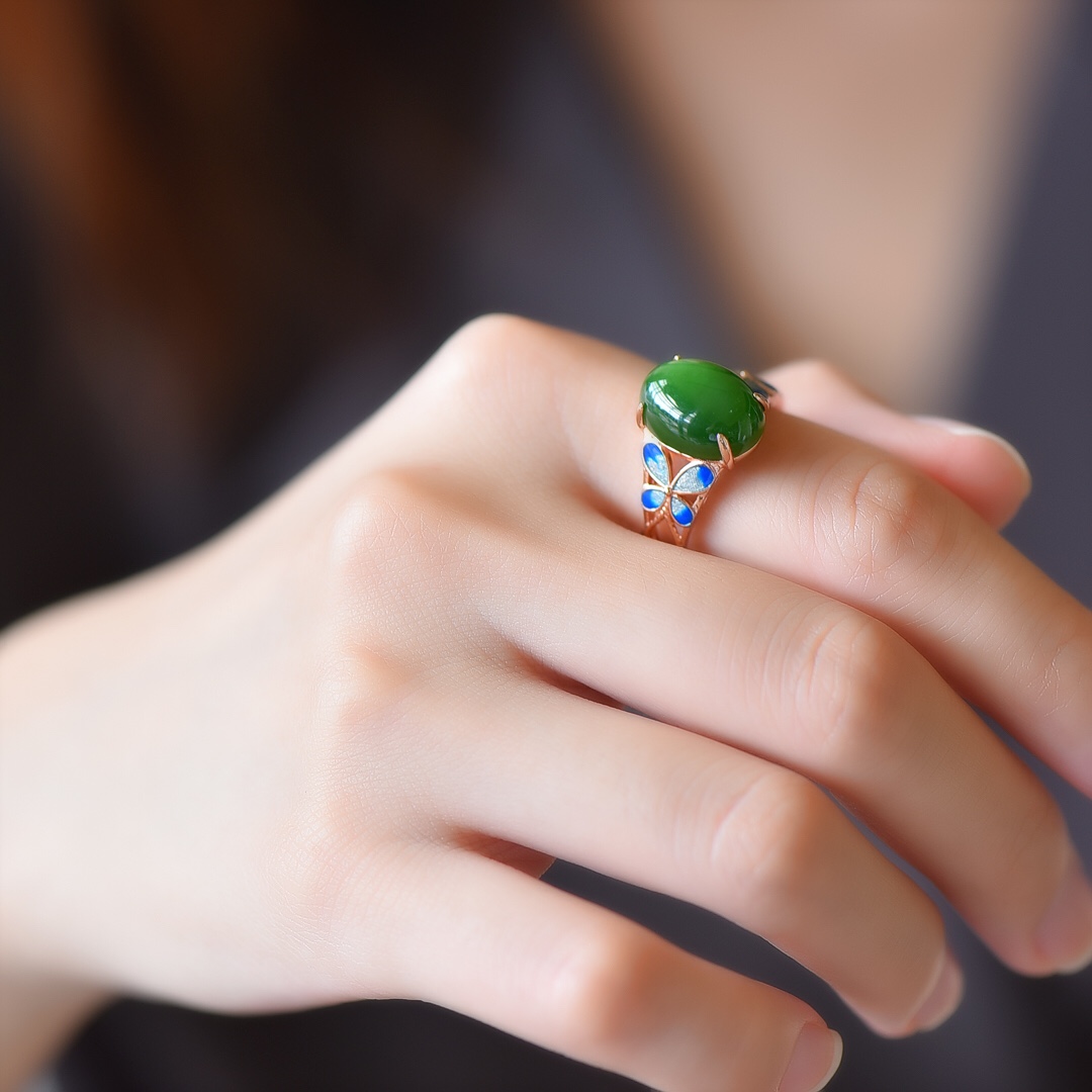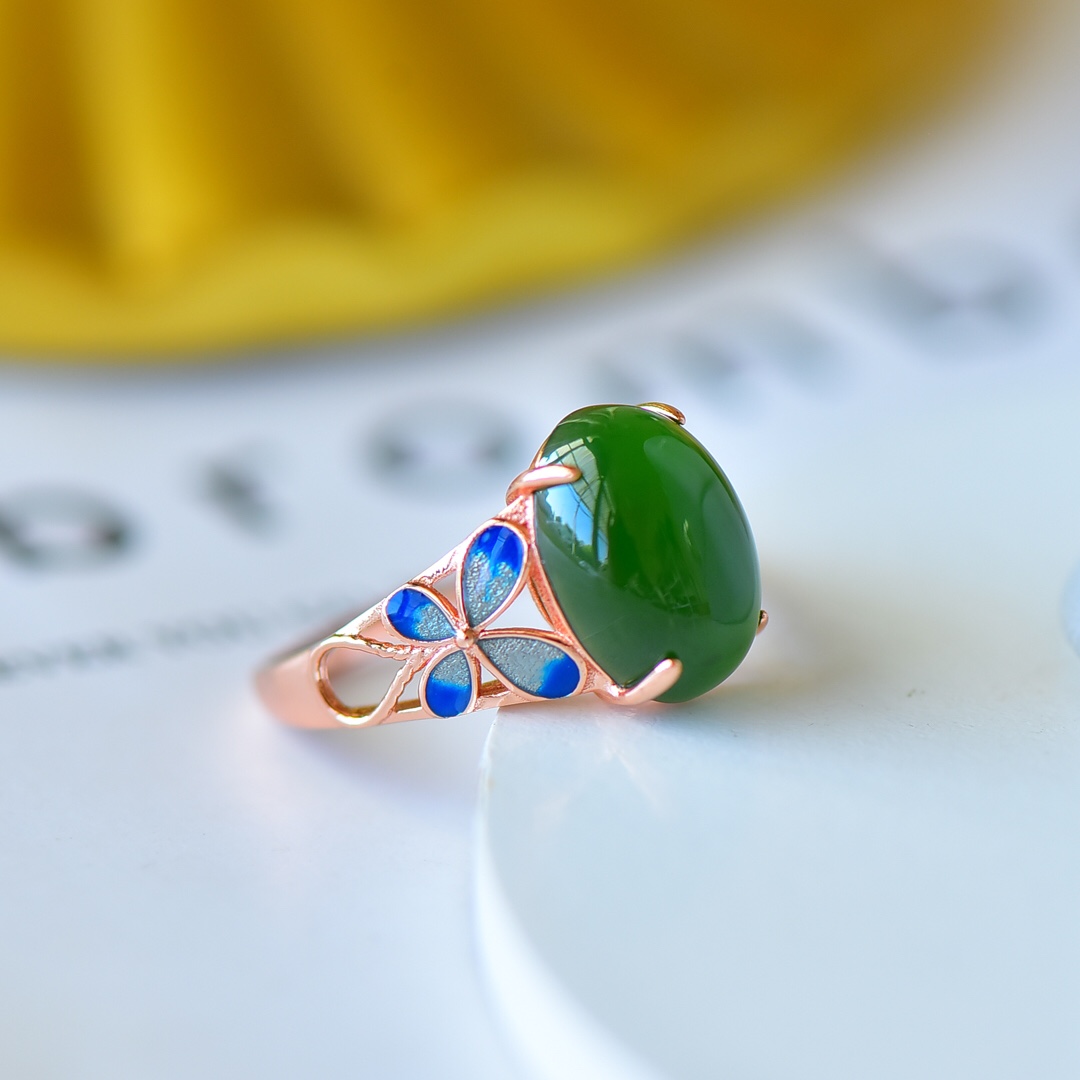 S925银镀18K金镶嵌天然新疆和田玉蛋面戒指高档时尚指环玉石饰品