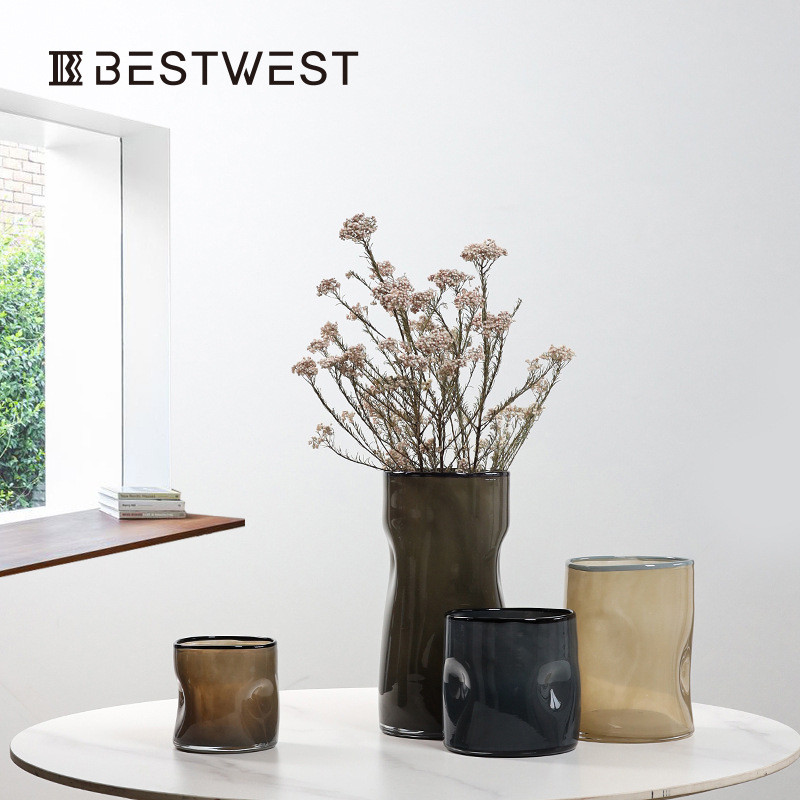 热销博西家居茶绿色直筒按坑玻璃花瓶现代简约高级感轻奢插干花摆