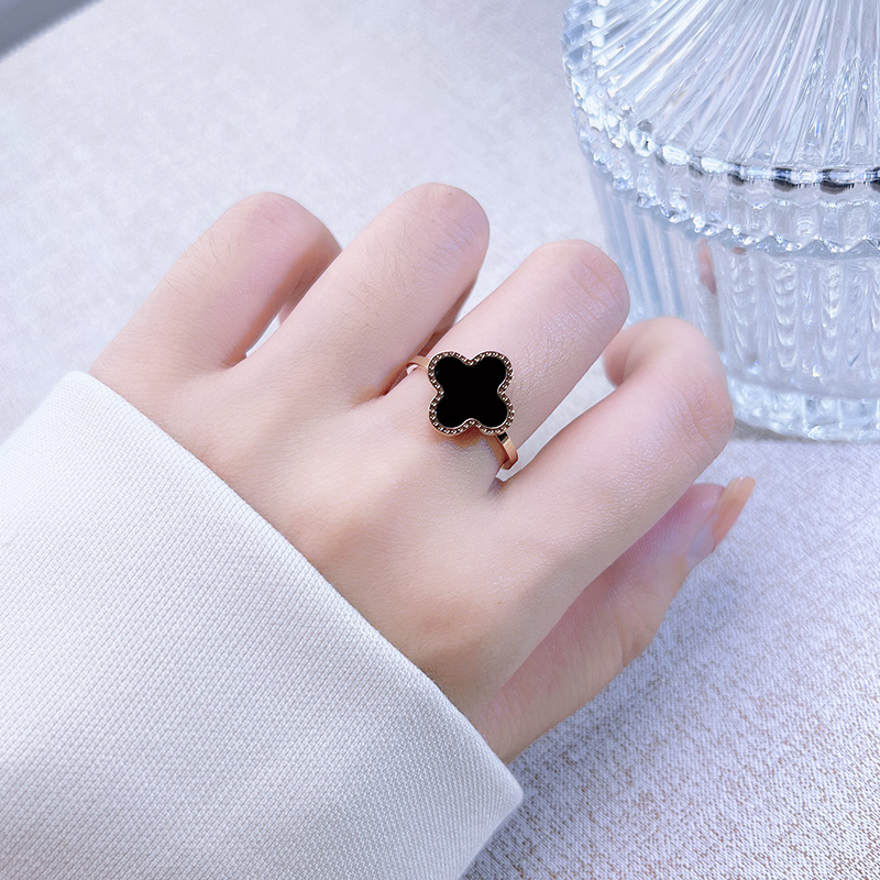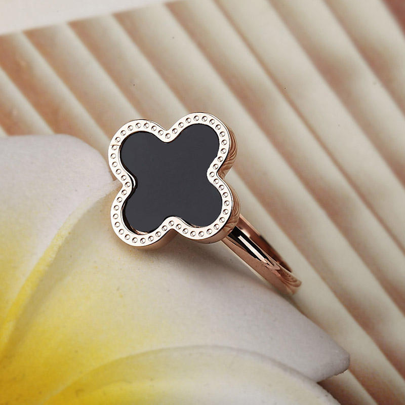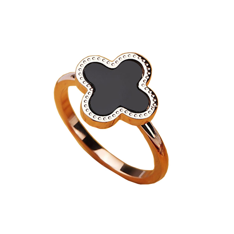 四叶草戒指女网红钛钢镀18k玫瑰金彩金幸运草简约黑色玛瑙戒子