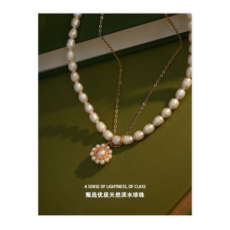 kev法式双层叠戴太阳花天然珍珠项链女夏轻奢高级感锁骨链颈链