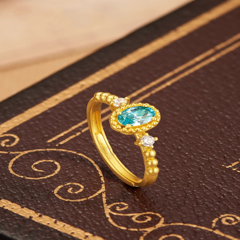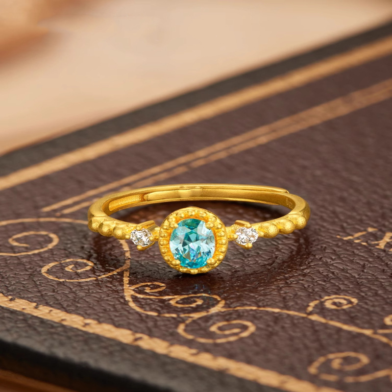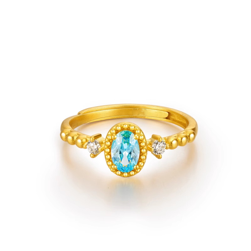 新品蔚蓝金色戒指古法镶嵌锆石蓝色海洋之心戒指首饰