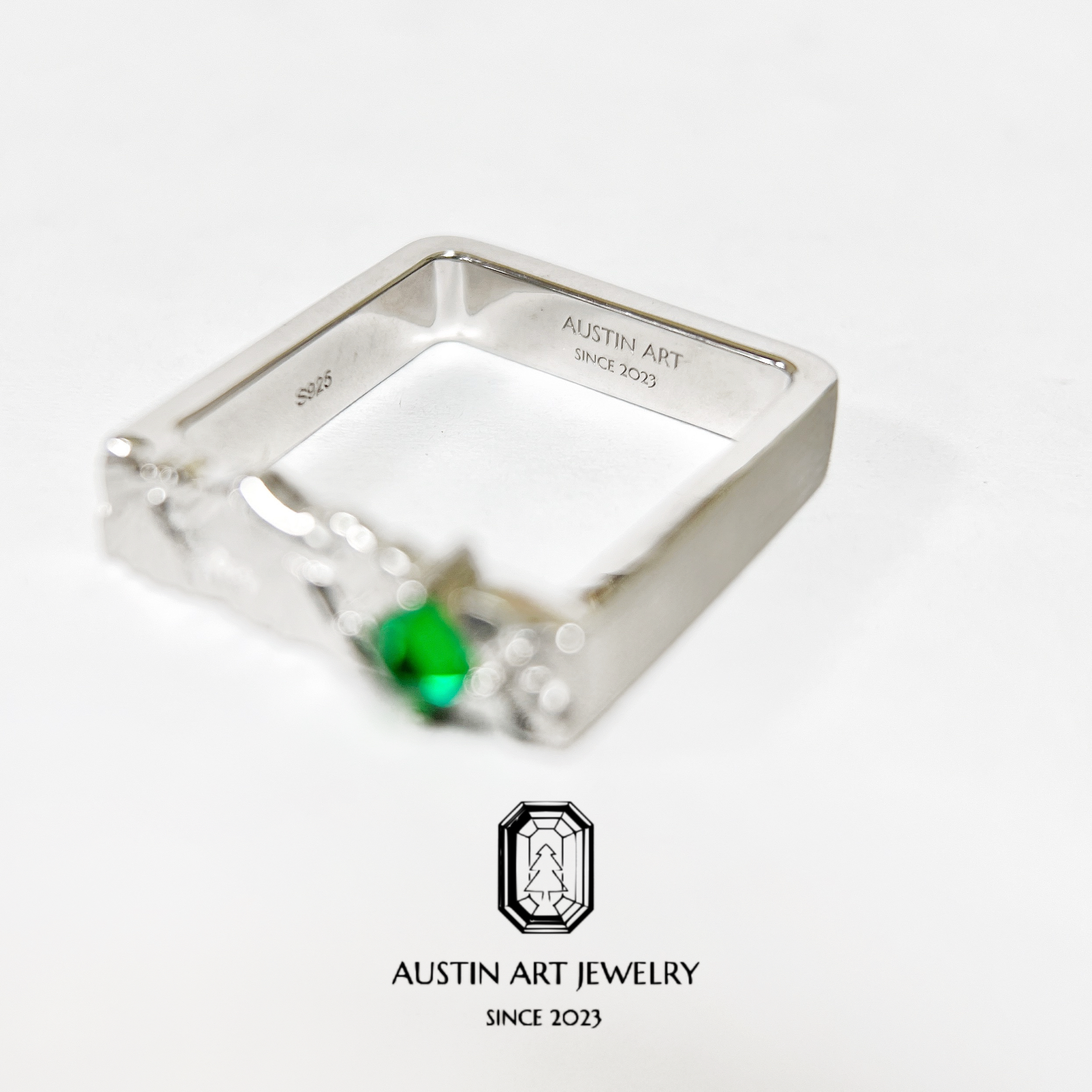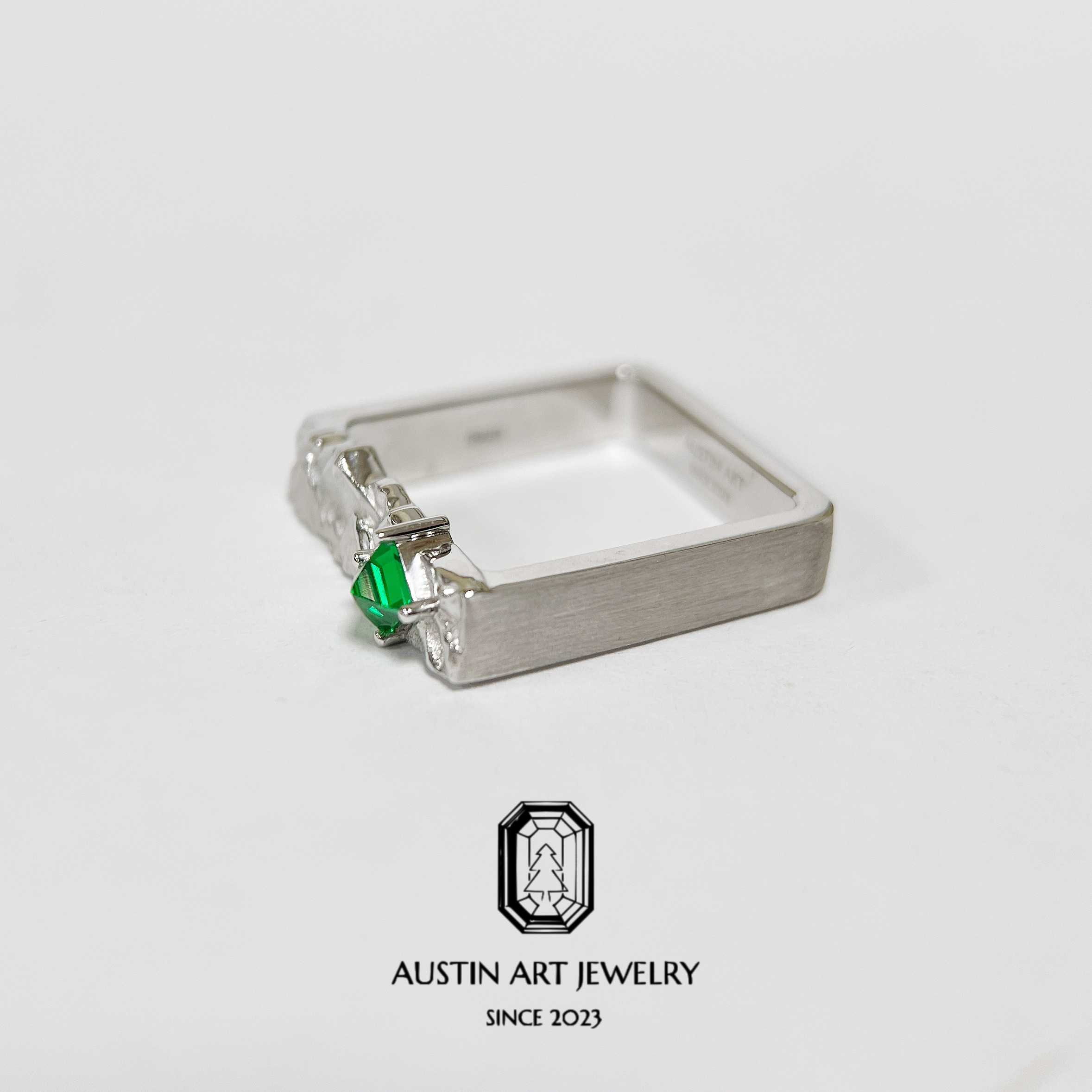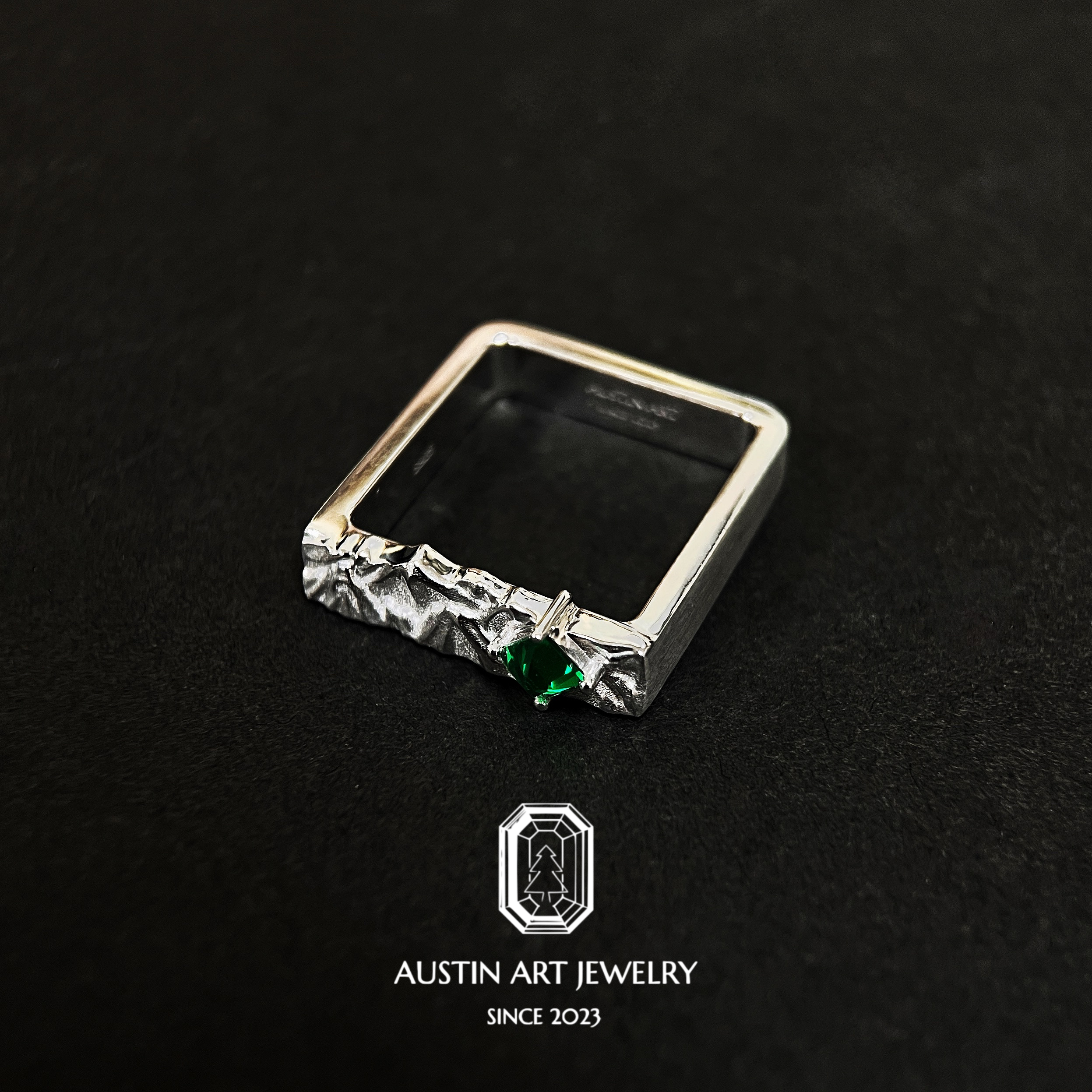 AUSTIN翱森·山止川行 山峰戒指 男戒风培育祖母绿 拉丝工艺