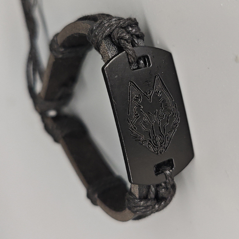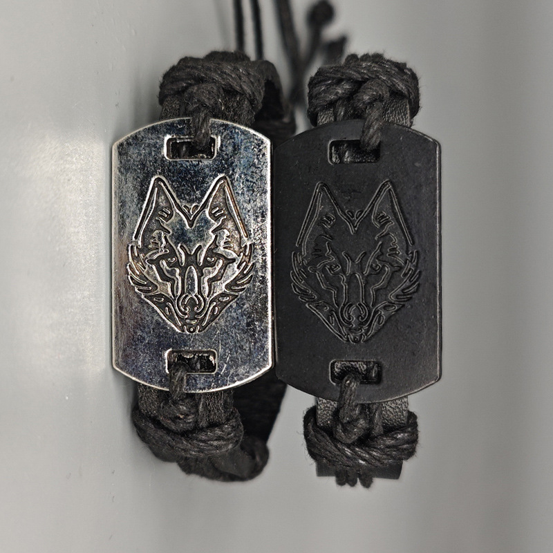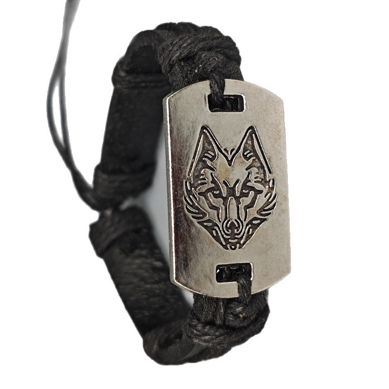 藏式民族风光板狼头合金编织可调节手环朋克皮革手链黑色暗黑