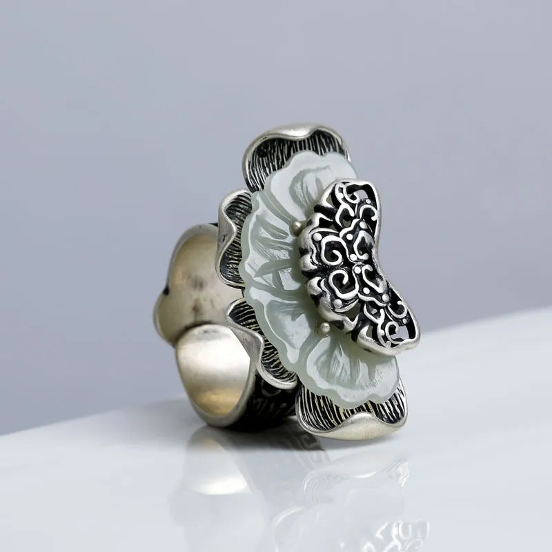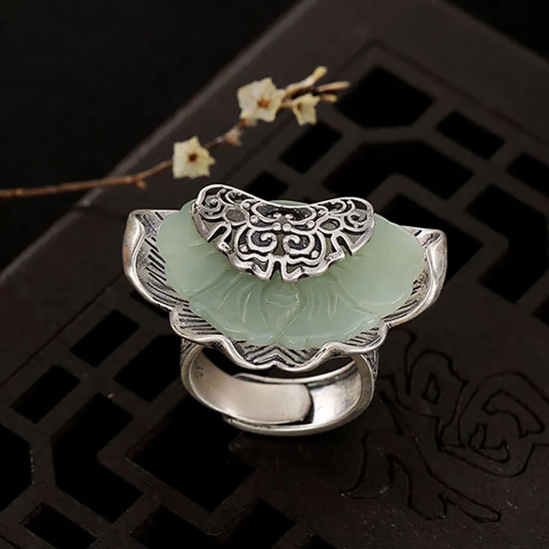 复古做旧厚实质感夸张中国民族风镀银仿和田玉蝴蝶戒指女开口