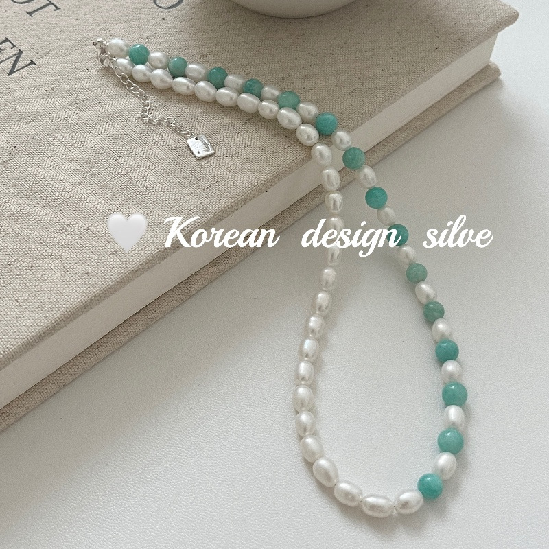 2024款韩国ins风饰品 S925纯银珍珠绿纹石不对称项链叠戴毛衣链女