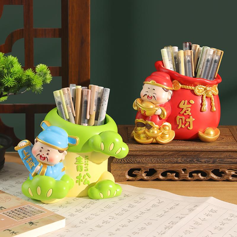 创意财神爷笔筒办公室桌面收纳盒工位招财装饰学生房间改造小物件