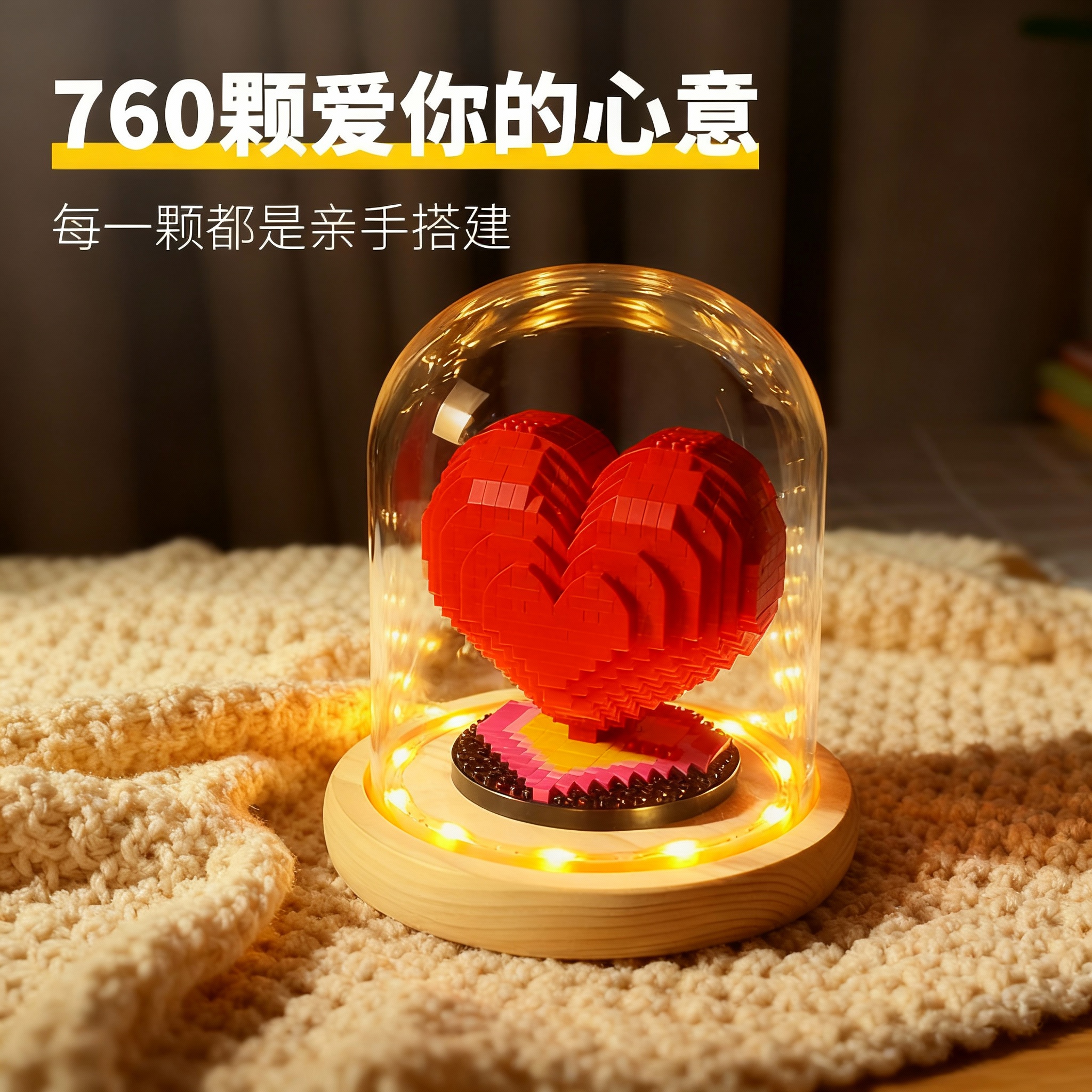 手工DIY爱心积木装饰摆件LED灯光木质桌面创意礼物