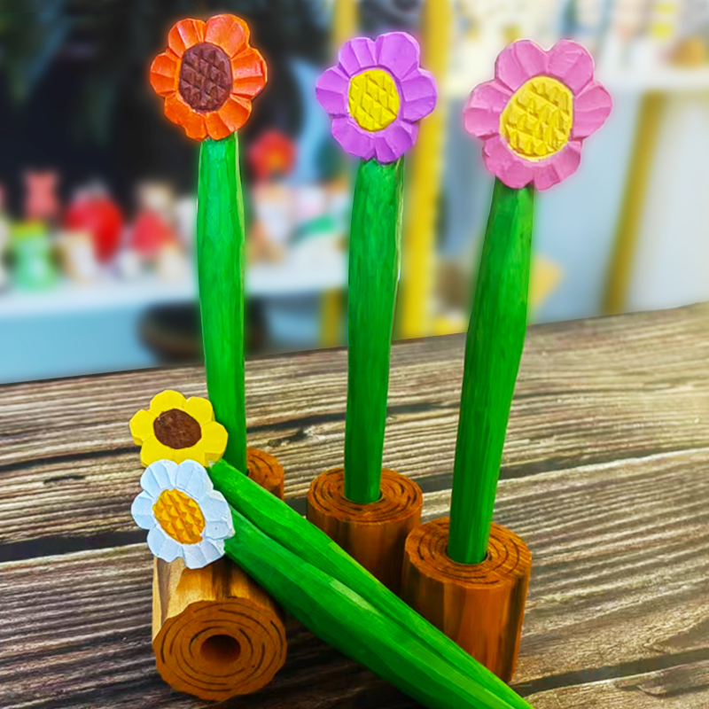 木雕摆件鲜花中性笔纯实木手工雕刻教师学生文具礼物木质工艺品
