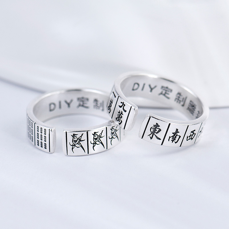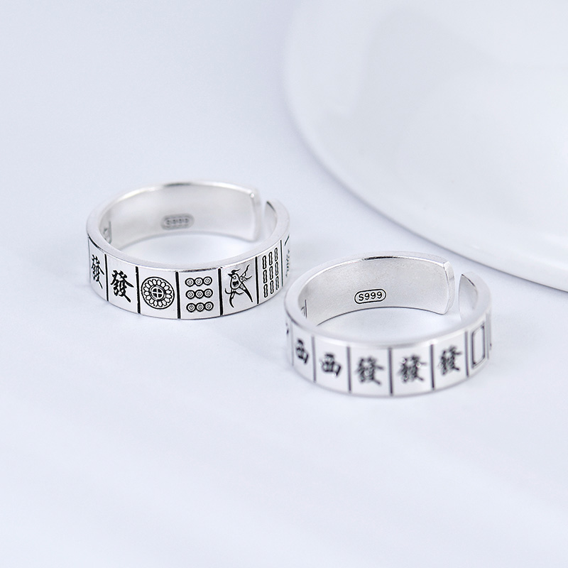 雀圣 S999足银开口可调节指环潮男女转运发财 麻将纯银戒指十三幺