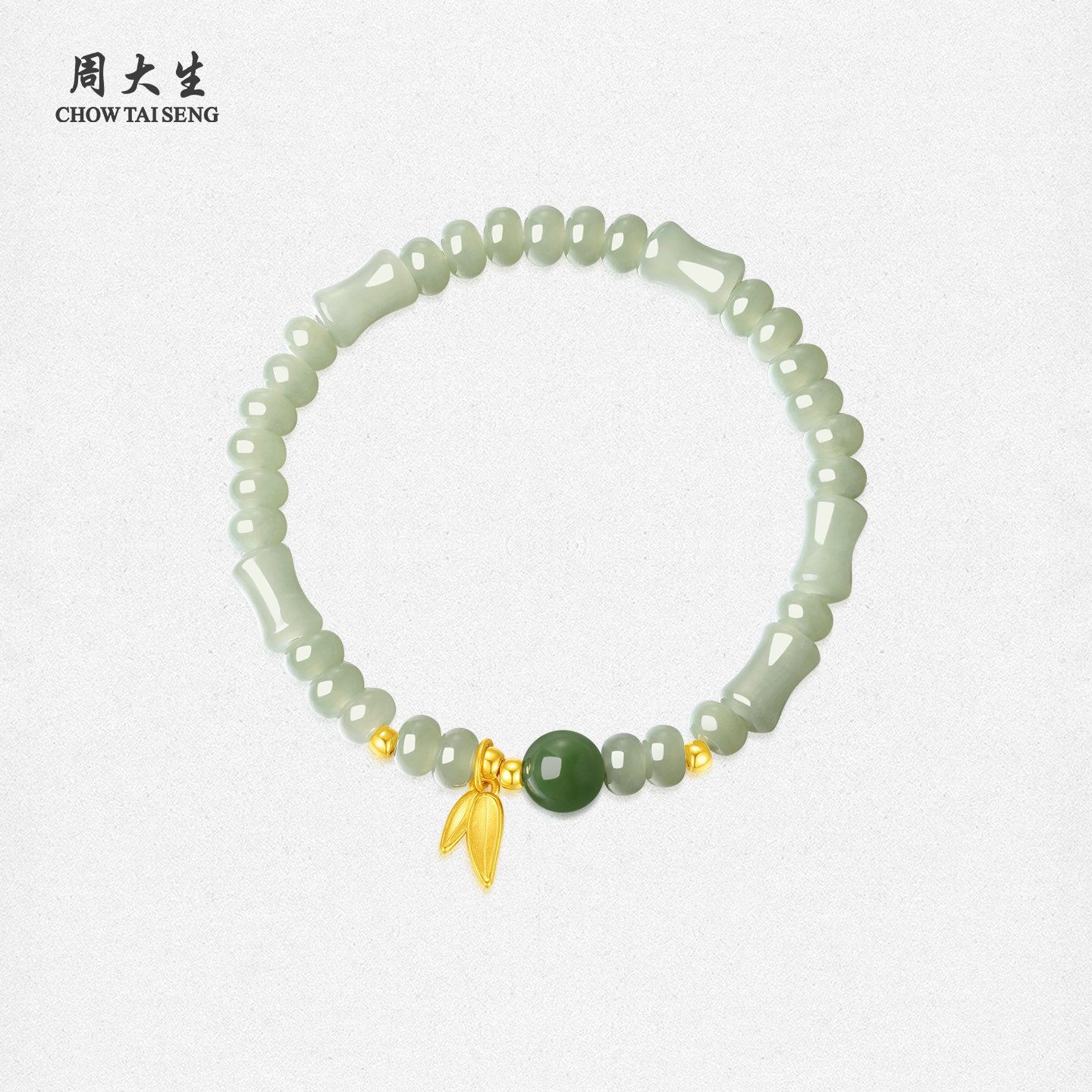 周大生黄金和田玉手串女足金镶玉石算盘珠竹叶手链送女友生日礼物