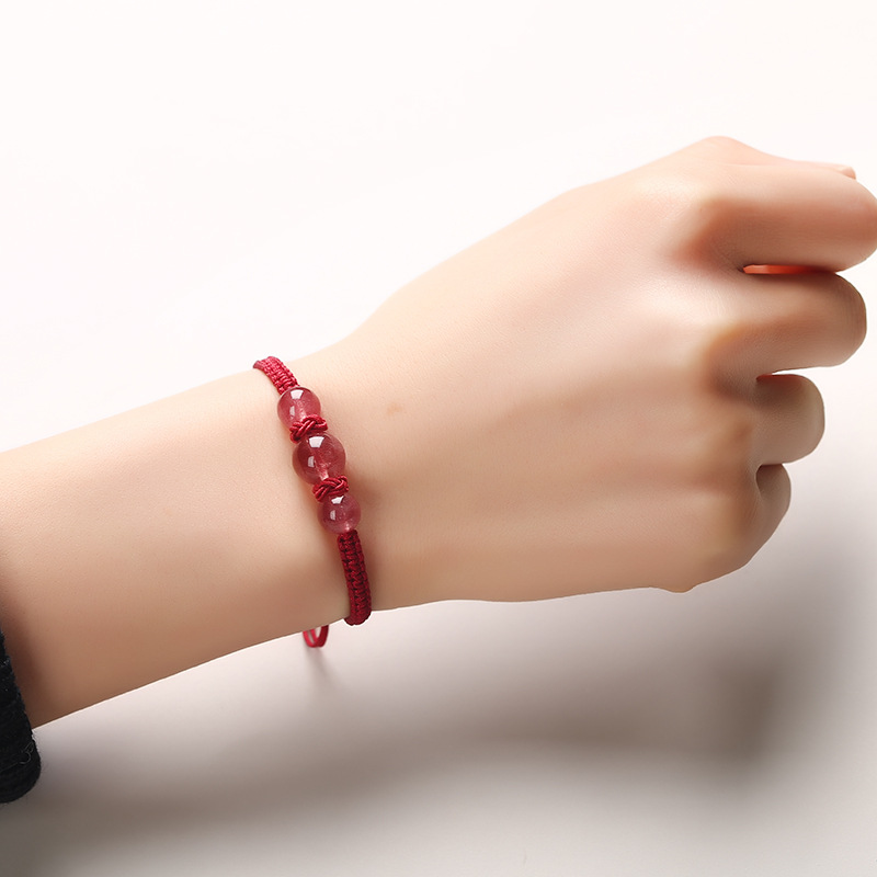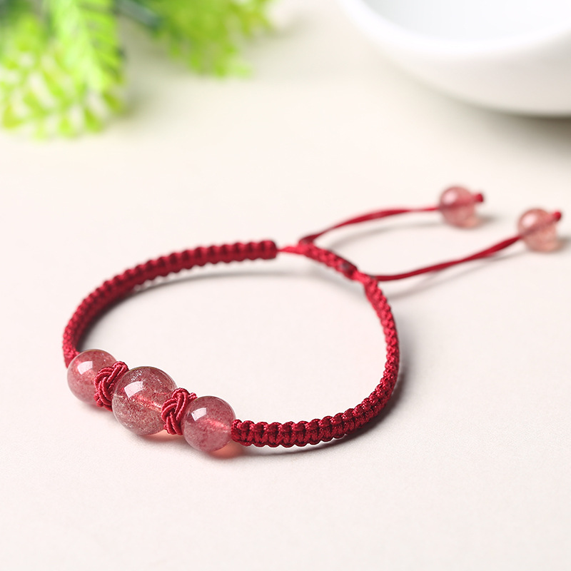 森系草莓晶手链女粉色水晶红绳编织手串黑黑曜石情侣闺蜜