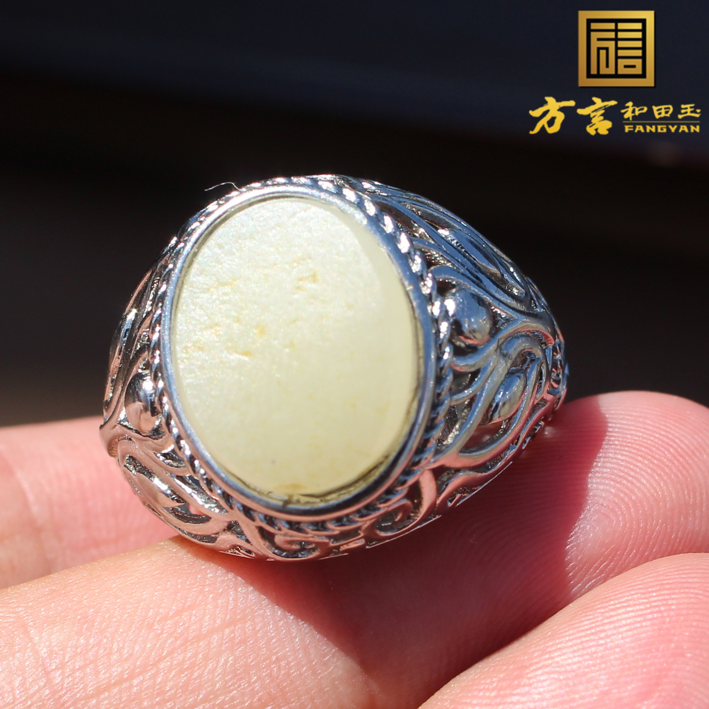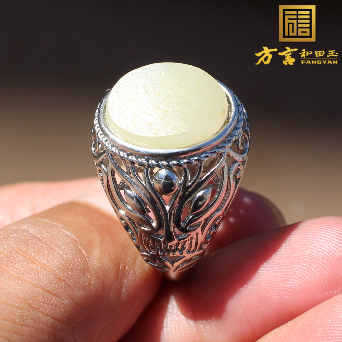 嗨翻天方言和田玉精品特色新疆洒金皮无结构白玉银镶钳戒指扳指A1