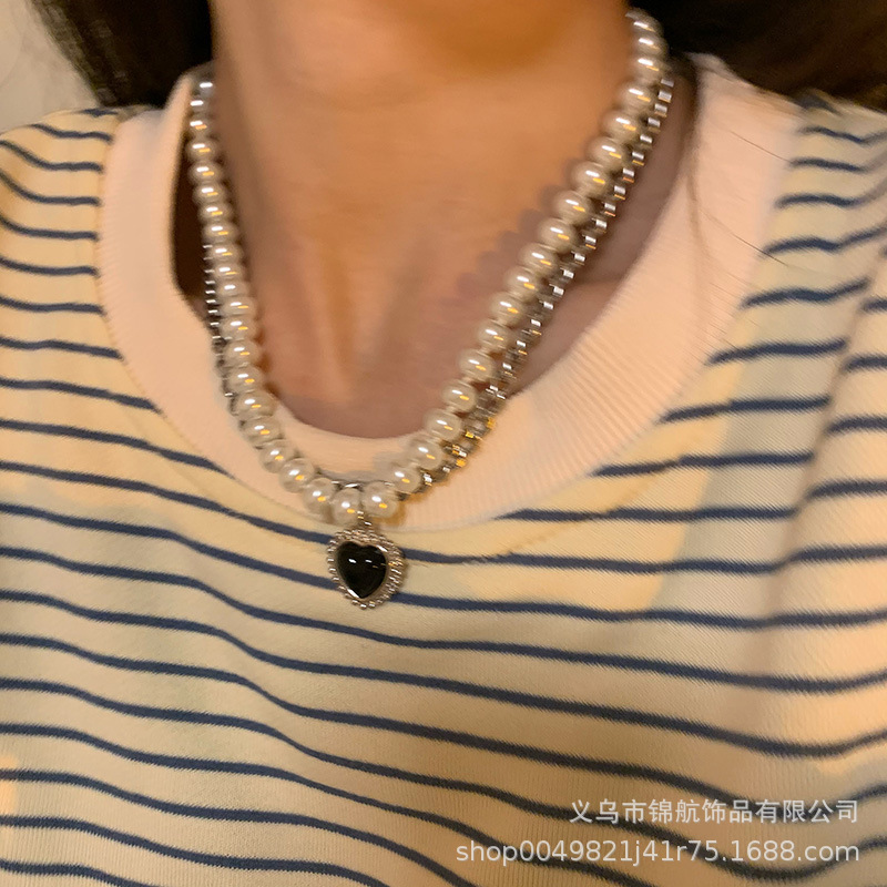 黑色爱心 双层叠戴项链女ins嘻哈冷淡风复古珍珠锁骨链2023年新款