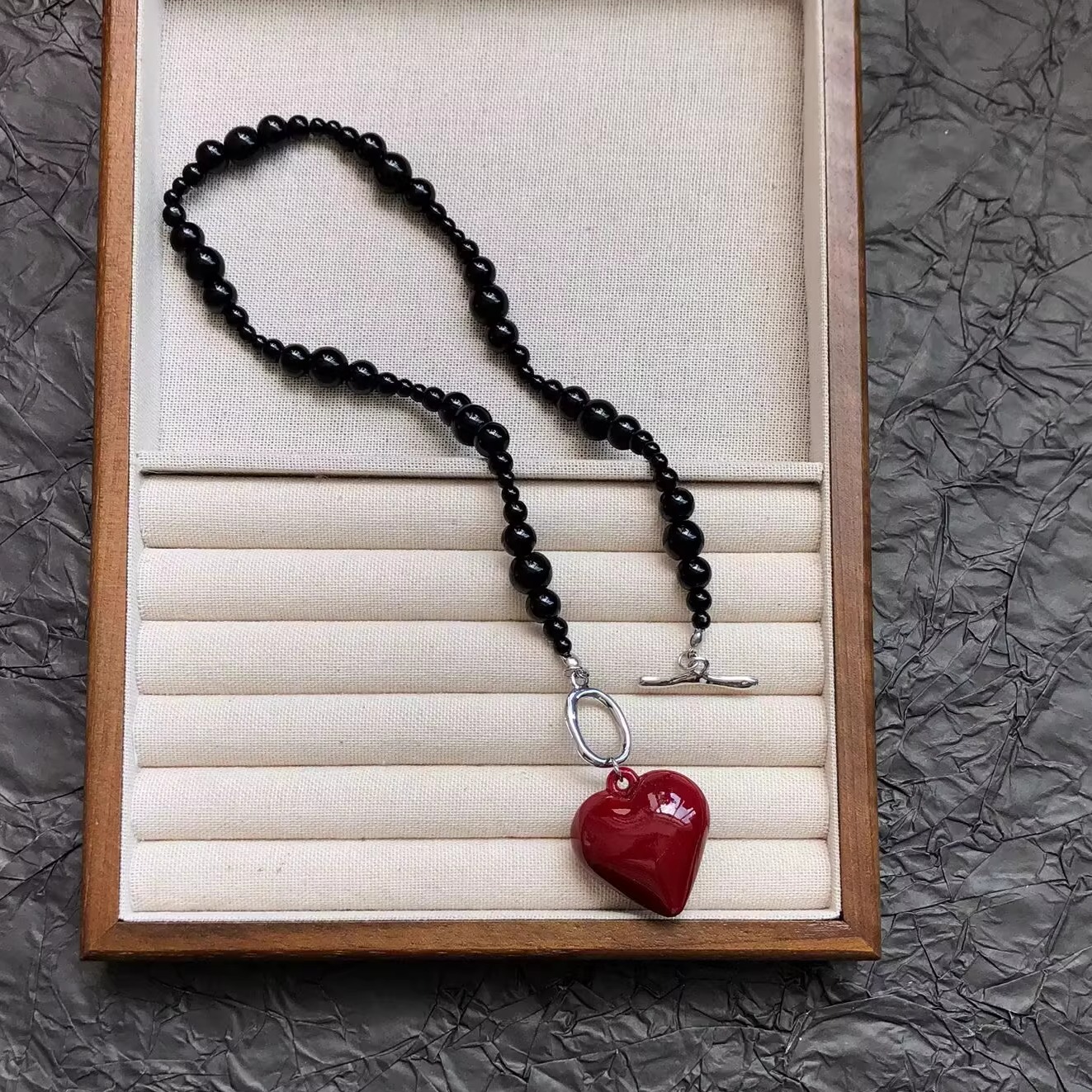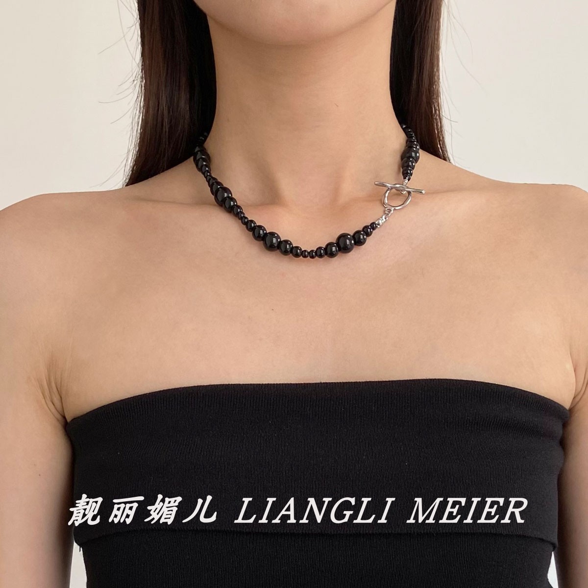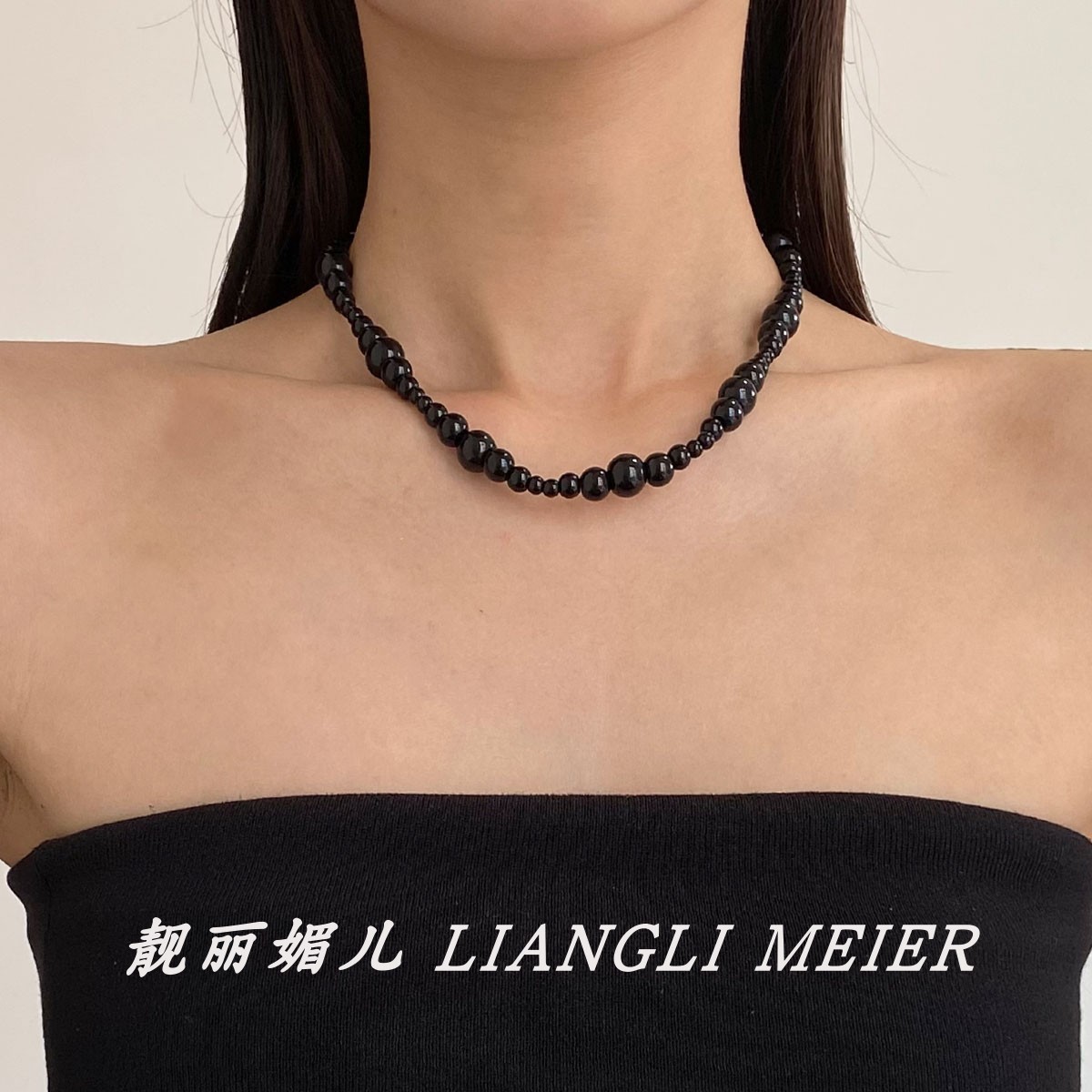 复古小众渐变不规则串珠金属OT扣颈链女黑色玛瑙圆珠项链锁骨链