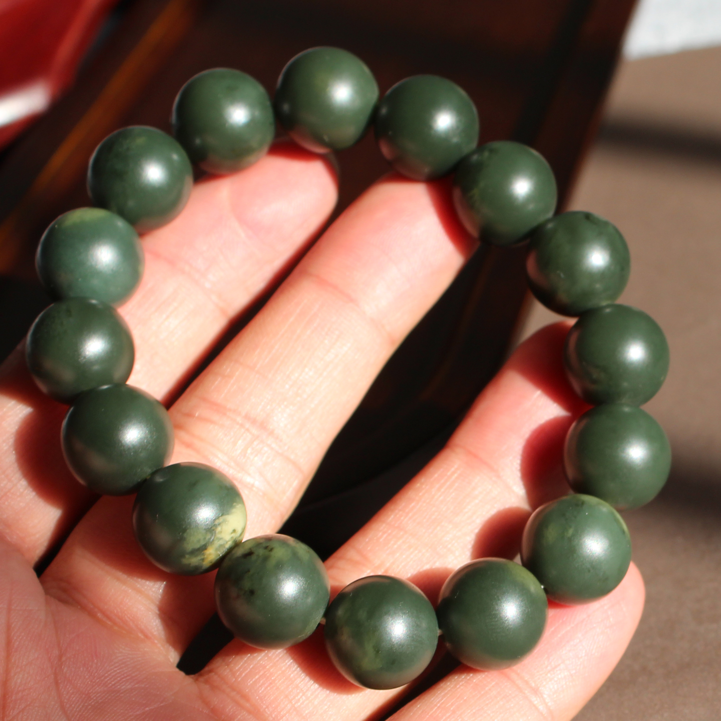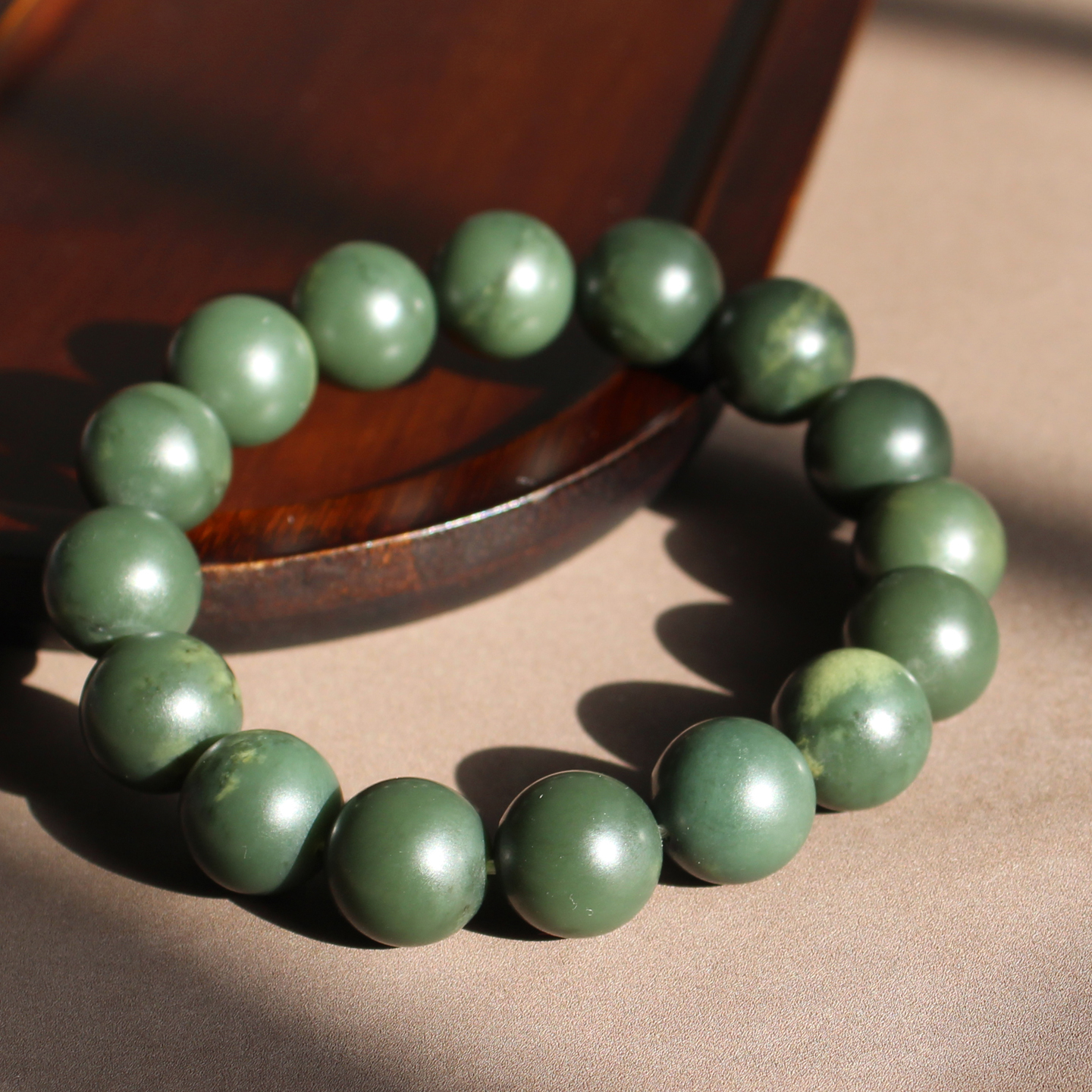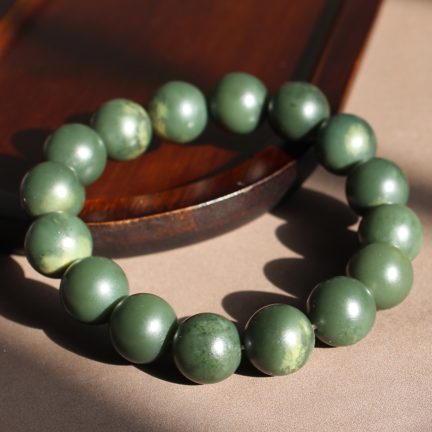 嗨翻天方言和田玉精品新疆玉龙河绢丝状沙枣青籽料14mm圆珠手串A1