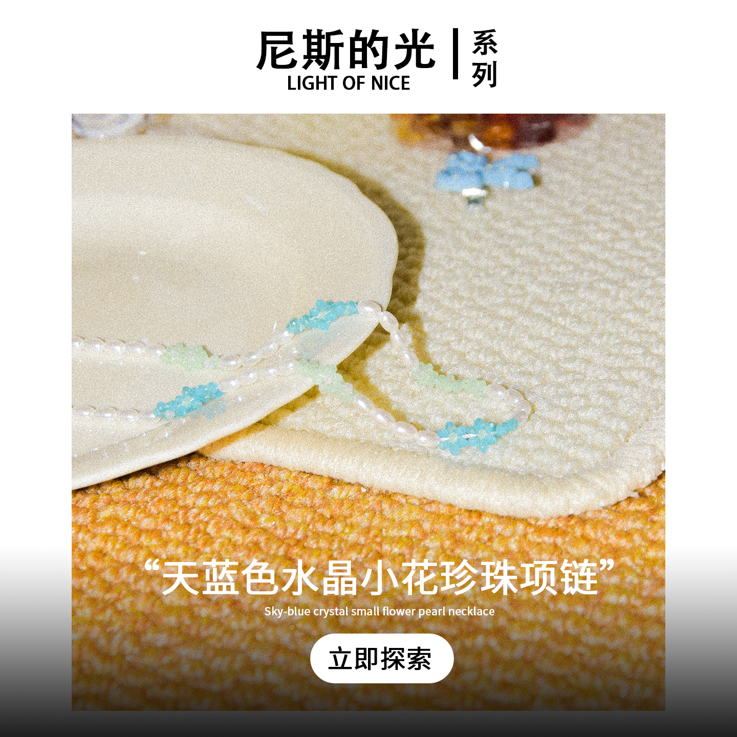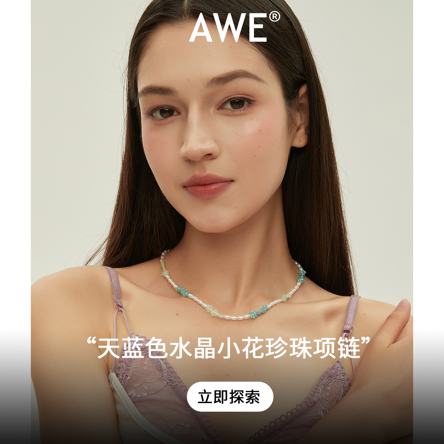 AWE天蓝色水晶小花珍珠项链配裙子刘嘉欣同款小清新穿搭锁骨链女