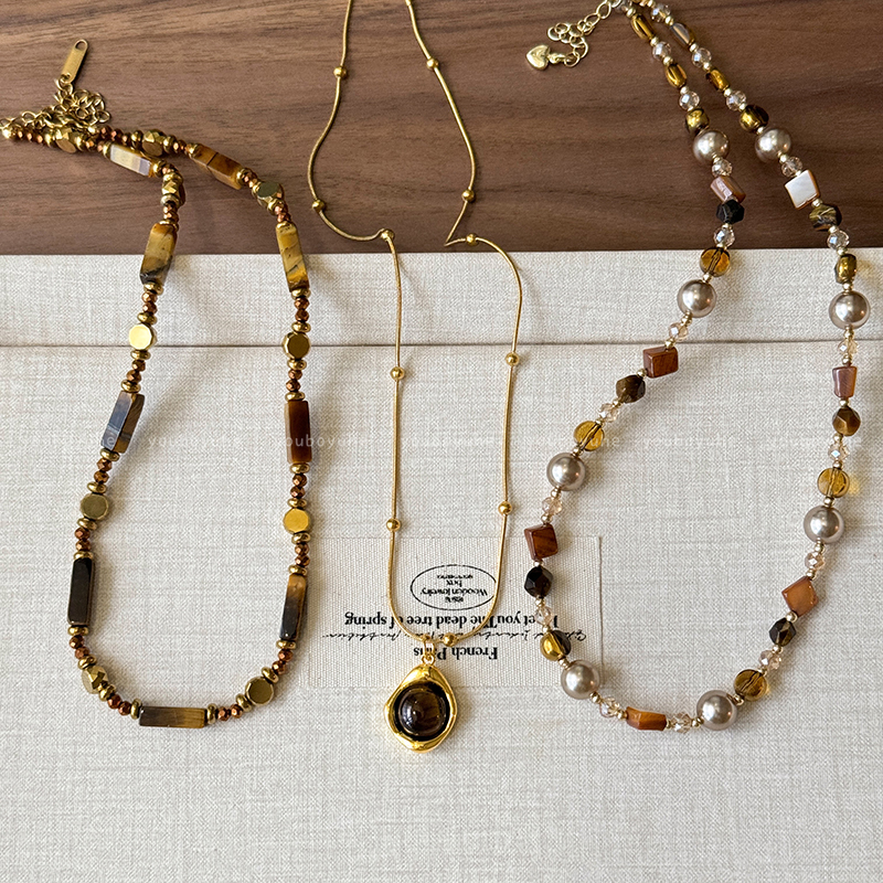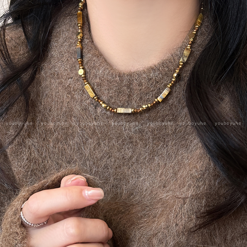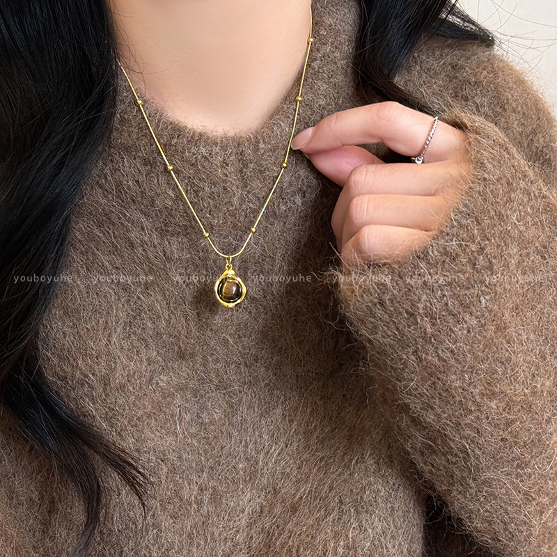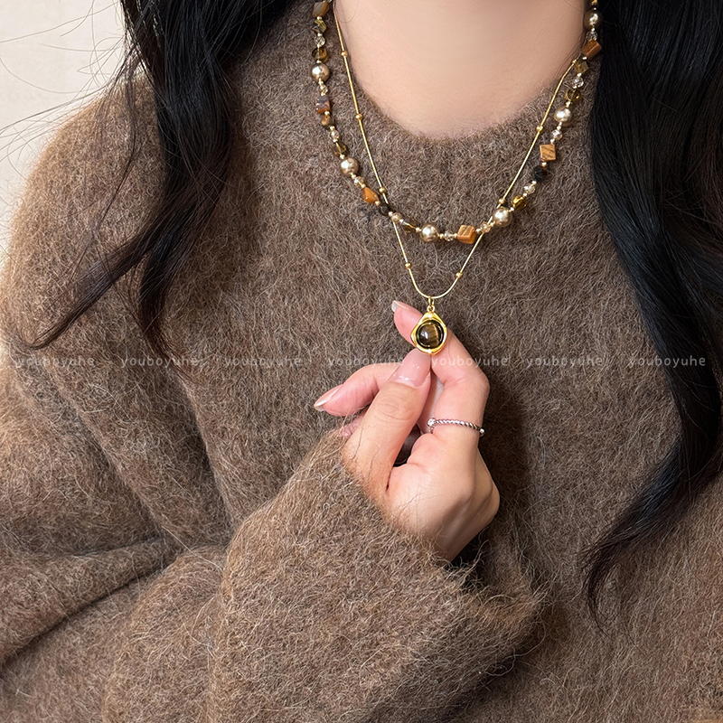 双层虎眼石水滴吊坠项链女复古气质串珠颈链毛衣链高级感叠戴配饰